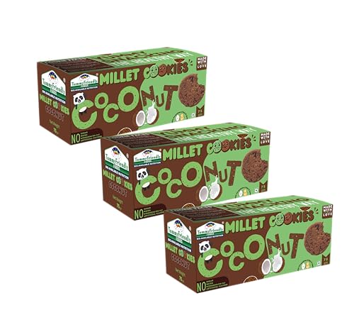 Millet Cookies Pack of 3 - 75 grams each. Coconut Millet Cookies. Indulge in the perfect fusion of wholesome goodness and tropical delight with our Millet Coconut Cookies. Crafted with care these cookies cater to a variety of dietary preferences making them an ideal choice for everyone from toddlers to adults. Elevate your snacking routine with our Millet Coconut Cookies â a harmonious blend of millet and coconut that not only satisfies your cravings but also supports your health goals. Choose a snack that delights your taste buds and nourishes your body.