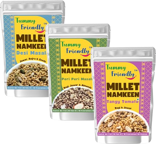 TummyFriendly Millet Namkeen Mixture for Kids and Adults.Healthy Snacks Items Namkeen for Kids, Adults, Pregnant Women, Diabetics. Healthy Snacks for Diabetics. No Chemicals, No Preservatives - Millet Snacks Assorted Combo 3 Pack, 70g Each (Desi, PeriPeri