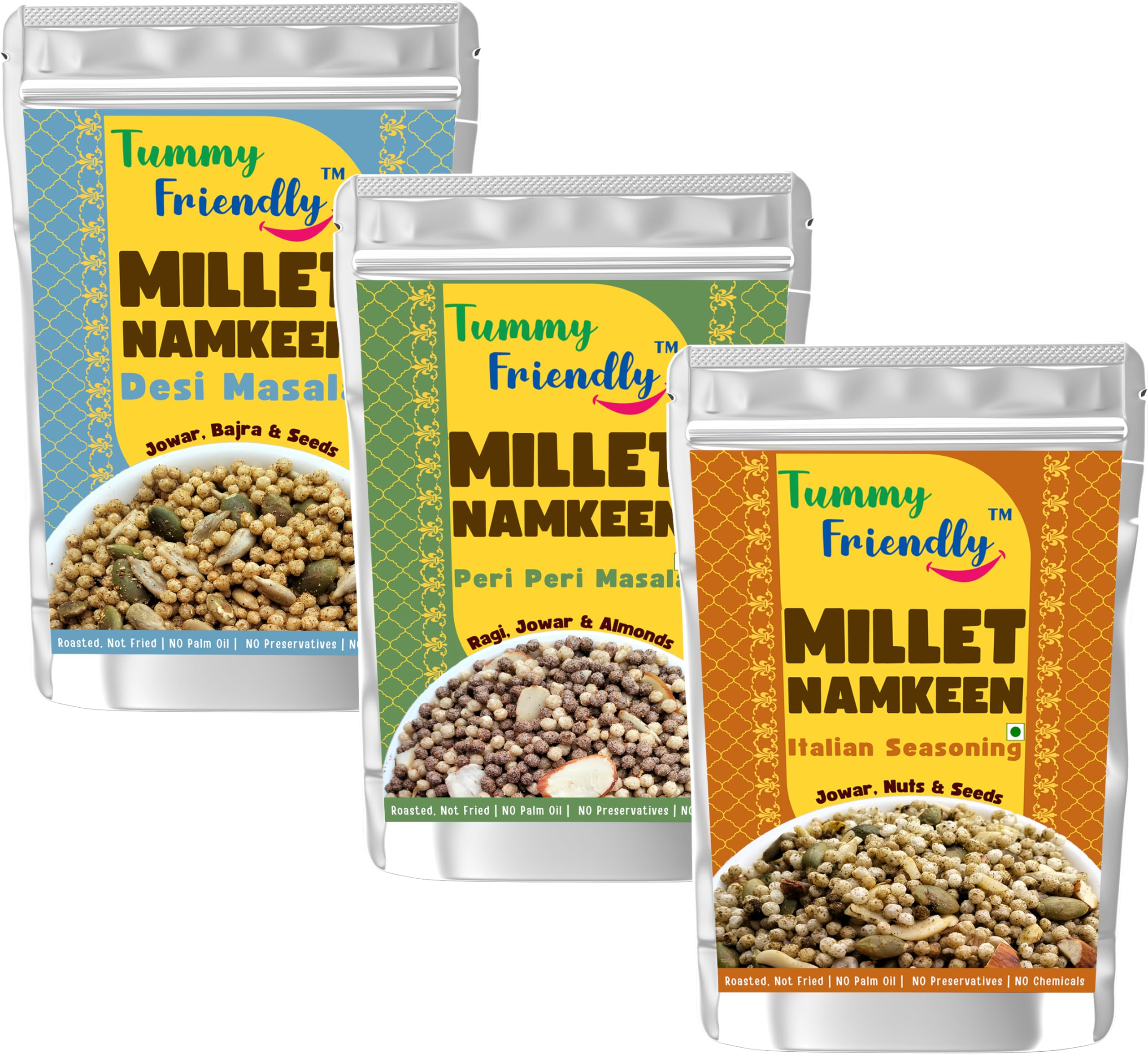 TummyFriendly Millet Namkeen Mixture for Kids and Adults.Healthy Snacks Items Namkeen for Kids, Adults, Pregnant Women, Diabetics. Healthy Snacks for Diabetics. No Chemicals, No Preservatives - Millet Snacks Pack of 3, 70g Each (Desi, PeriPeri, Italian-3X