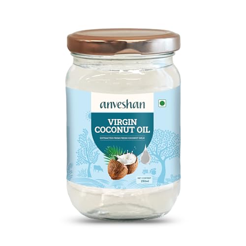 Anveshan Cold Pressed Virgin Coconut Oil 250ML | Glass Jar | Unrefined Cold Pressed Virgin Coconut Oil Naturally Cholesterol Free Kolhu/Kacchi Ghani/Mara Chekku/Ganuga Rich Aroma & Flavour of Real Coconuts A1 Grade Coconuts