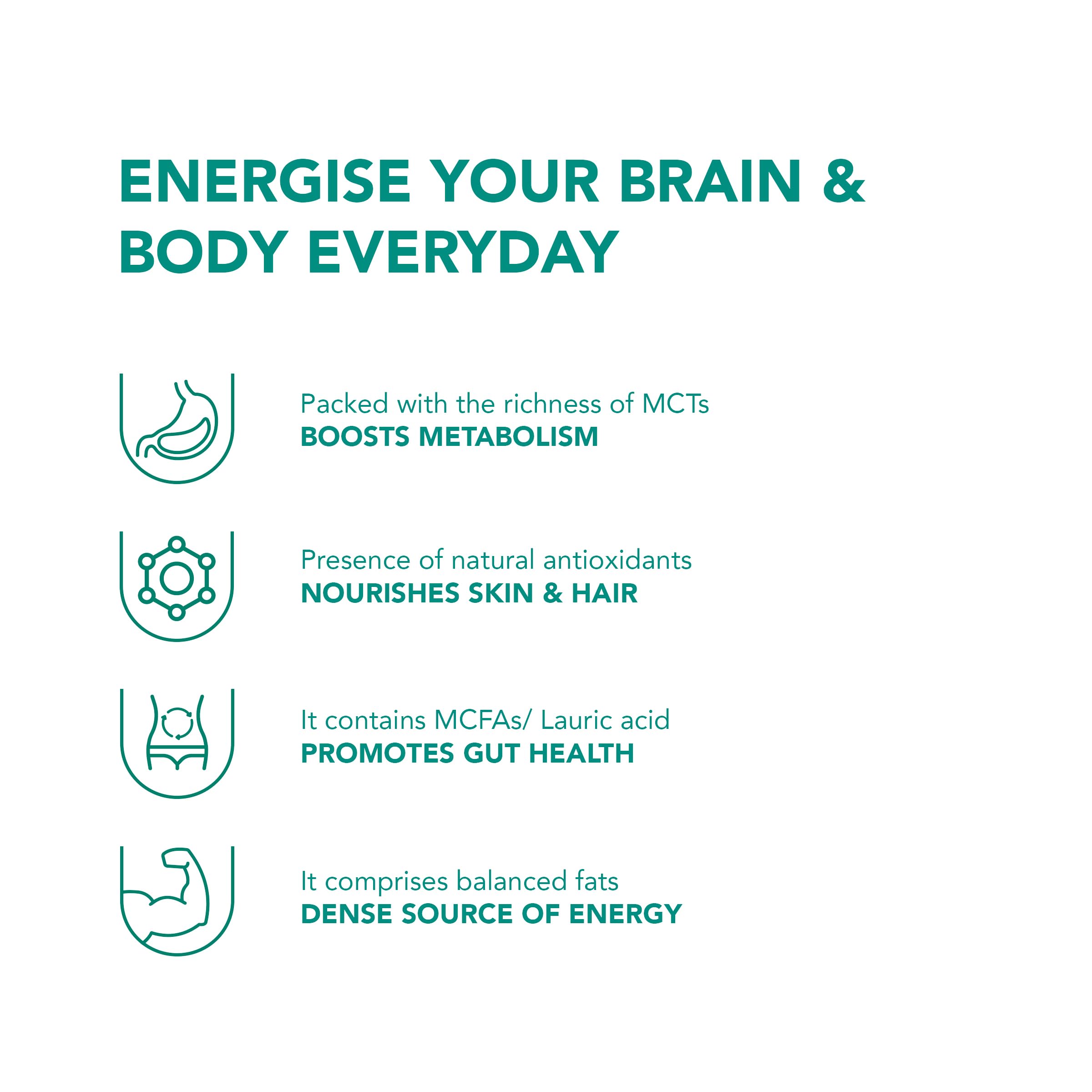 COCONUT OIL NUTRITION: Our cold-pressed coconut oil retains all naturally occurring nutrients. It includes capric caprylic and lauric acids which enhance the feeling of fullness and decrease overall food intake. It is a natural energy booster a great sour