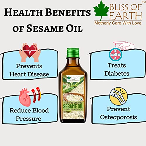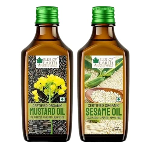 Bliss of Earth Organic Mustard Oil is extracted by cold pressing of sunflower seeds without using hexane. It is a good source of vitamin K and Omega 3 & 6. It also has high levels of both alpha-linolenic acid and erucic acid. Mustard oil demonstrates strong anti-microbial property and is anti-inflammatory in nature. Most valuable health benefit of Mustard oil can be attributed to its strong stimulant property. It helps improves circulation boosts metabolism relieves sinus congestion and most importantly invigorates digestion Organic Sesame Oil is extracted by cold pressing of white sesame seeds without using hexane. Sesame seeds are rich sources of protein vitamins and antioxidants. It has an ability to generate heat and energy in the body and its numerous beauty and hair benefits sesame seeds are loaded with nutrition that makes it a must-have in your winter diet.