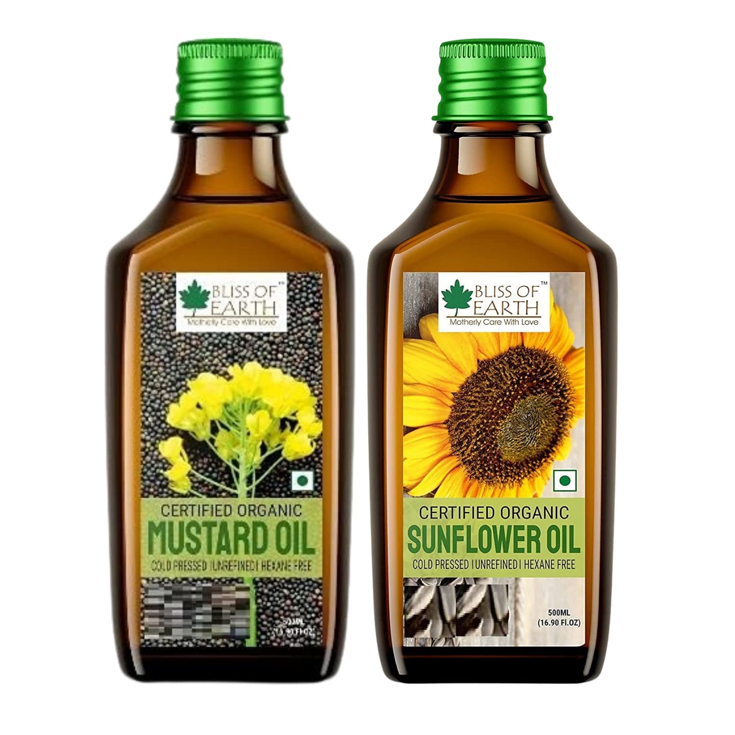 Bliss of Earth Organic Mustard Oil is extracted by cold pressing of sunflower seeds without using hexane. It is a good source of vitamin K and Omega 3 & 6. It also has high levels of both alpha-linolenic acid and erucic acid. Mustard oil demonstrates strong anti-microbial property and is anti-inflammatory in nature. Most valuable health benefit of Mustard oil can be attributed to its strong stimulant property. It helps improves circulation boosts metabolism relieves sinus congestion and most importantly invigorates digestionOrganic Sunflower Oil is extracted by cold pressing of sunflower seeds without using hexane. It is rich in nutrients vitamins and poly-unsaturated fats. It is also effective in decreasing cholesterol and good for hormonal activities. Golden light and healthy sunflower oil contains more Vitamin E and Omega 6 Fats than any other vegetable oil. It also contains linoleic acid an essential fatty acid and oleic acid. While linoleic acid is a polyunsaturated fat oleic acid is a monounsaturated fat.
