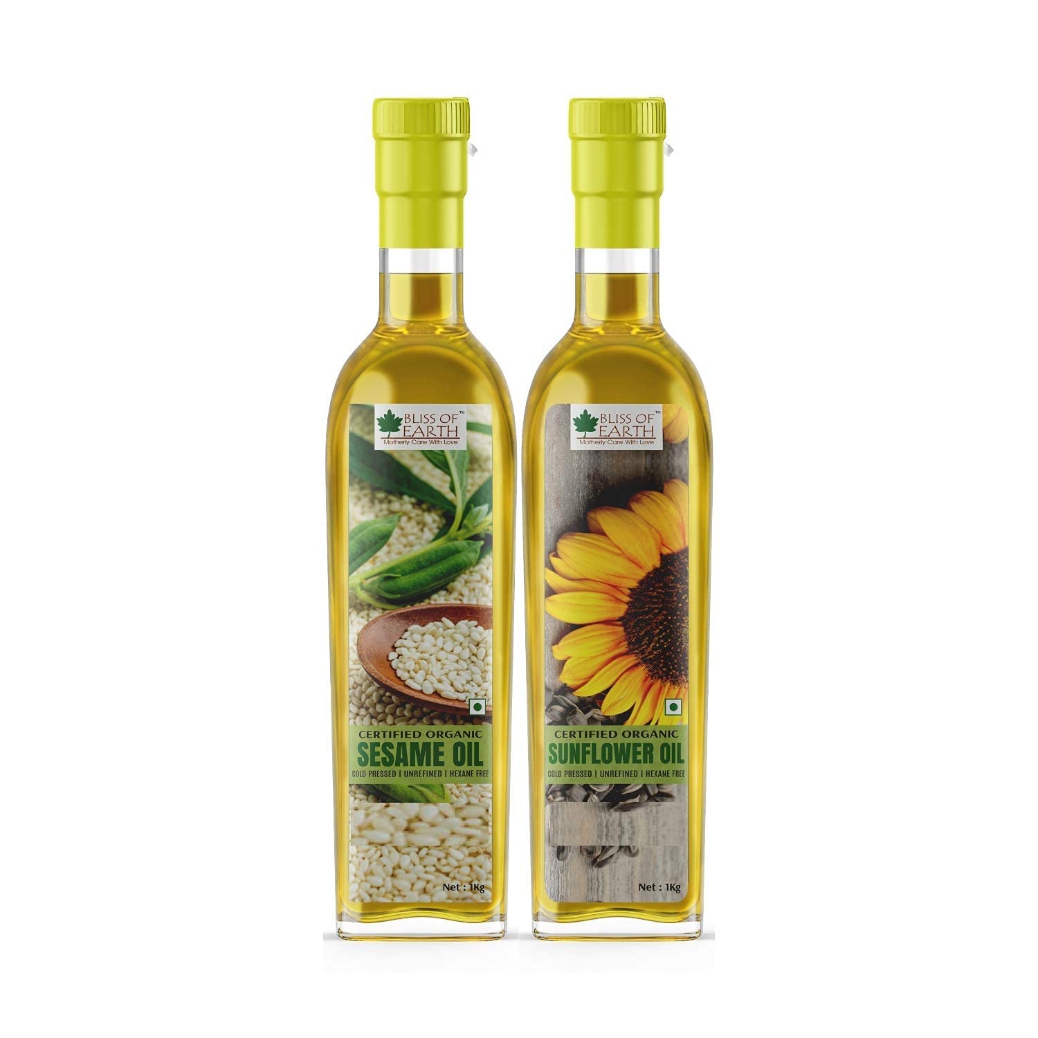 Certified Organic Sesame Oil Bliss of Earth Certified Organic Sunflower Oil is extracted by cold pressing of sunflower seeds without using hexane. It's rich in nutrients vitamins and poly-unsaturated fats. It is also effective in decreasing cholesterol and good for hormonal activities.