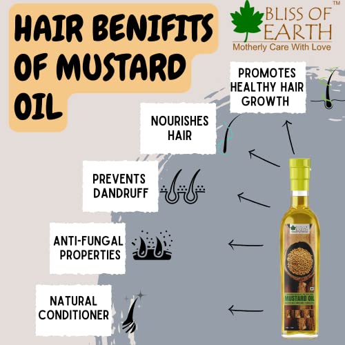 Bliss of Earth organic yellow mustard oil is premium quality pure 100% natural unrefined virgin cold pressed yellow mustard seed oil. It is free from chemicals and preservatives and is rich in Vit A & E calcium alpha omega-3 and alpha omega -6 fatty acid and anti oxidants which makes it an excellent hair vitalizer anti tan. Its antifungal antibacterial anti-inflammatory along with its healing and medicinal property which are highly beneficial for hair skin and body. For Smoother Face: It removes pimples and smoothens facial skin. Mix it with Bliss of Earth organic extra virgin coconut oil and massage your face for 5 minutes and then wipe with wet cotton cloth. For Long & Lustrous Hair: It is packed with vitamins and minerals particularly a high amount of beta-carotene which promote hair. It prevents scalp infection. Mix mustard oil with organic coconut and bliss of earth natural almond oil and warm it and massage hair for 15 minutes and then wash after 3 hours. For dark black hair: It is very effective in darkens your hair naturally. Apply the oil directly to your hair. Keep it there for half an hour and wash it off using Bliss of Earth Witch Hazel shampoo. For cracked Heels and Brittle Nails: It smoothens heels and strengthen nails. Mix candle wax with yellow mustard oil and fill your cracked heel with this mixture and sleep with cotton socks. Apply it over nails to lubricate the nail bed. For Baby Massage: It is good oil for massaging babies. It improves blood circulation and helps in muscle and bone growth. Take a little oil and warm it a bit. Take the warm oil in your palms and gently massage babyâs body