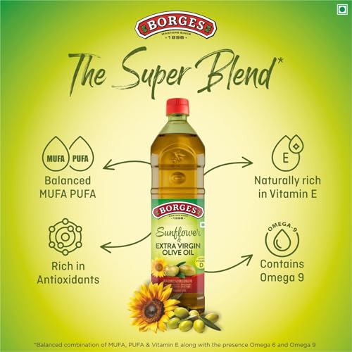 HomeGroceryCookingCold Pressed OilsBorges Super blend of Extra virgin Olive oil & Sunflower oil – 1 ltr | Ideal for Deep frying Shallow Frying all types of cuisines