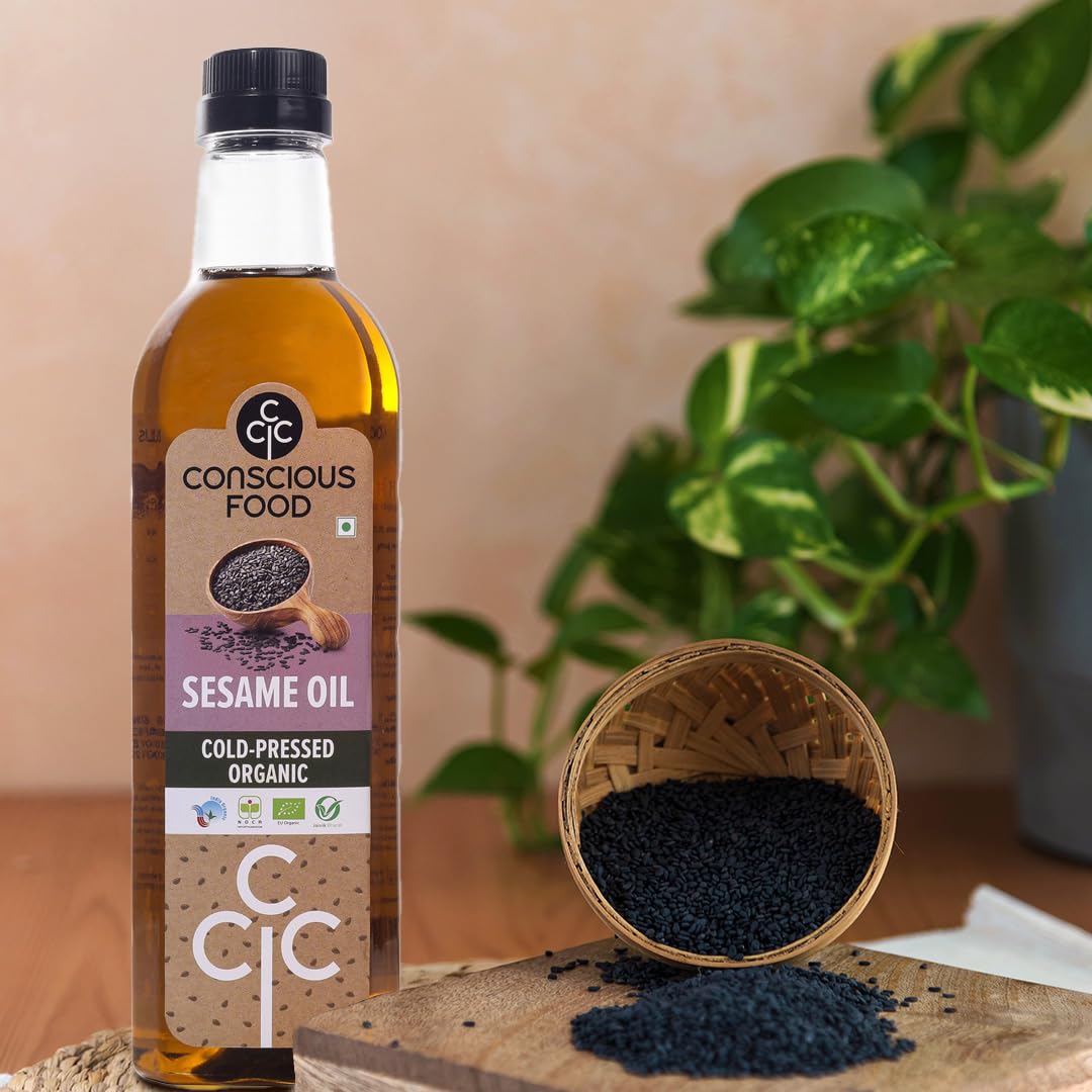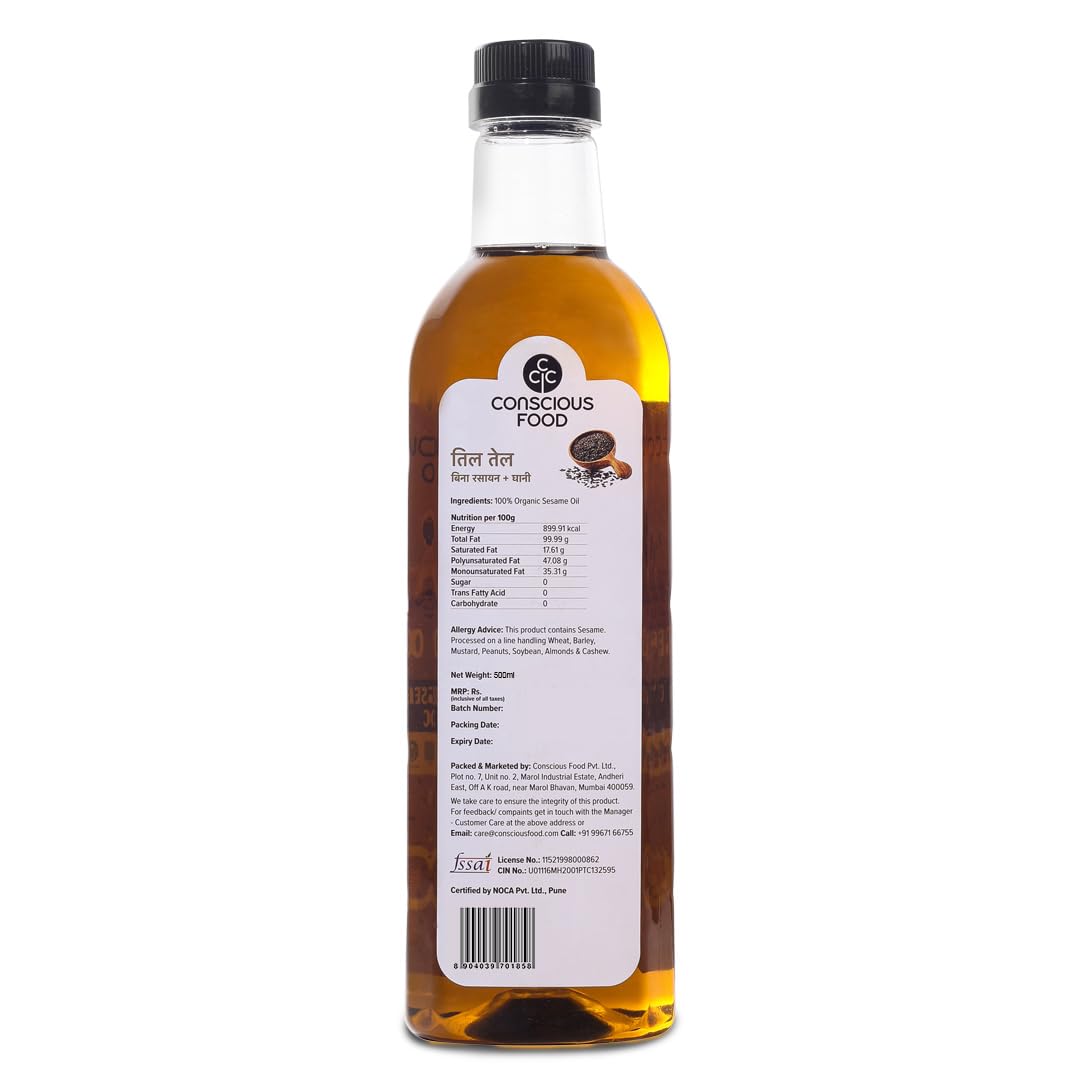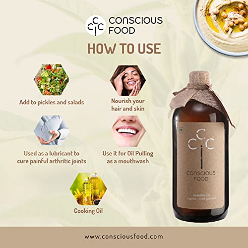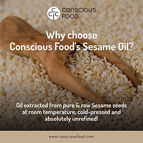 Conscious Food Organic Sesame oil in Glass bottle | High in Antioxidants Delicious & Healthy | Cold Pressed Sesame | Til OiL | 500ml