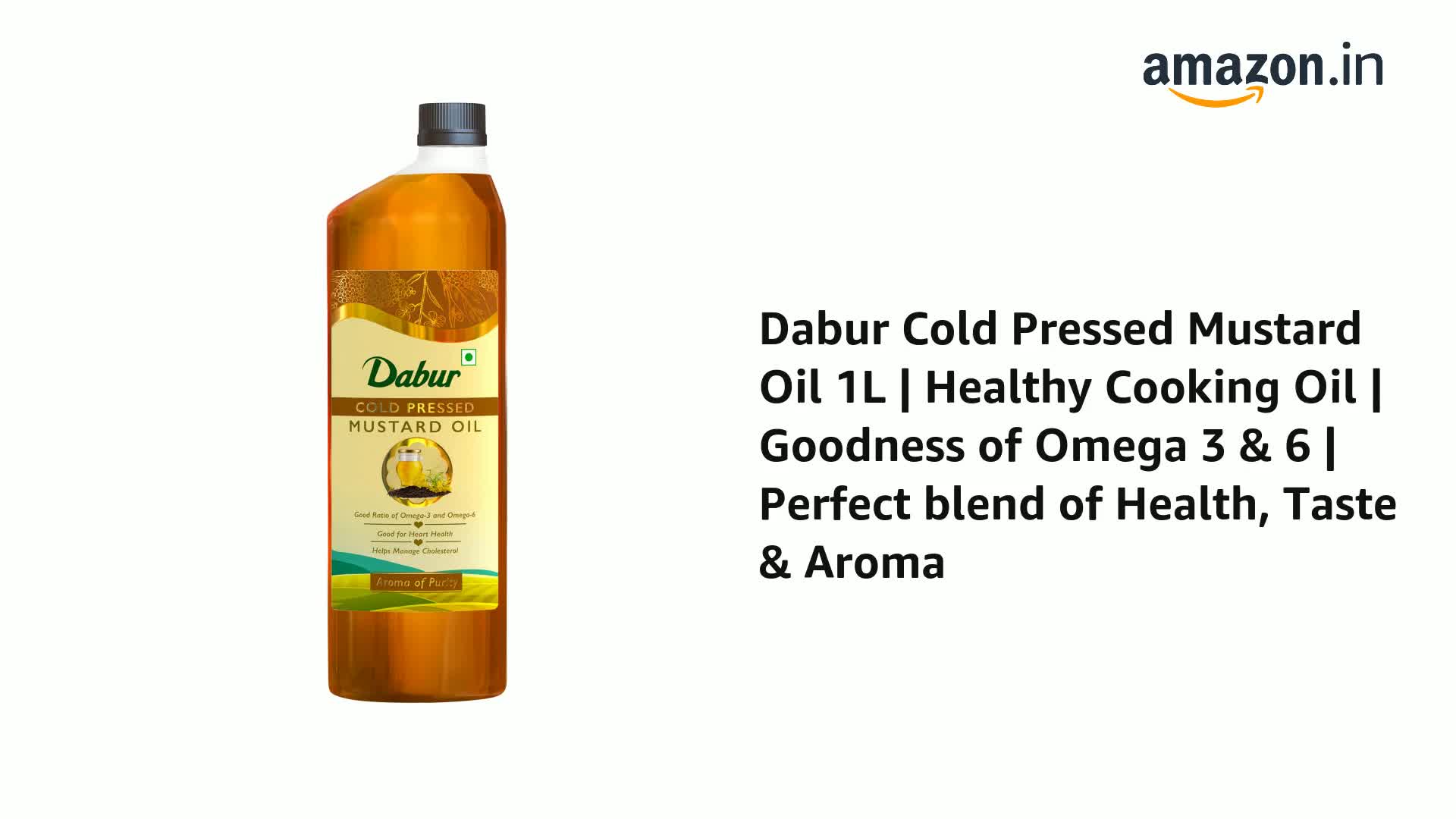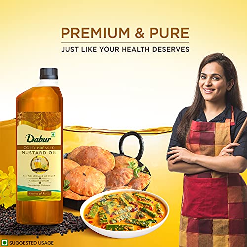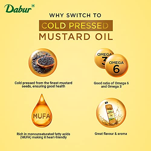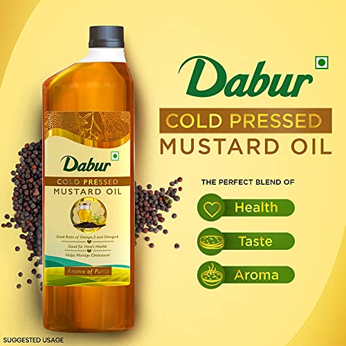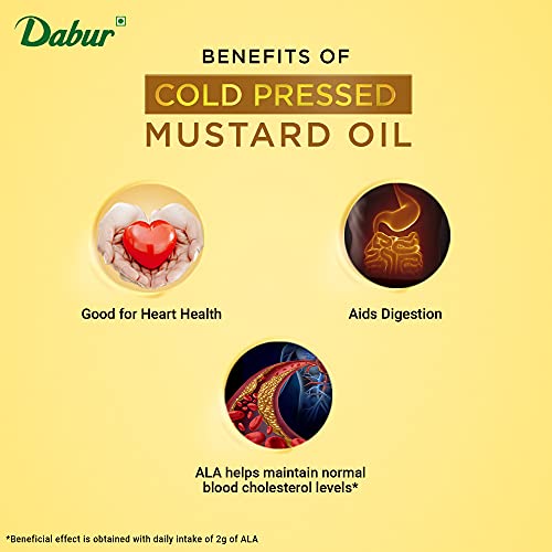 It is traditionally cold pressed from finest quality mustard seeds ensuring that the natural properties and health benefits are intact. It contains the good ratio of omega -3 and omega - 6 fatty acid. Daily consumption of DABUR cold pressed mustard oil gives way to healthy lifestyle.It is rich in monosaturated fatty acid making it good for heart and it also helps in managing cholesterol and improve blood circulation. Cooking with DABUR mustard oil gives a delicious twist to your dish with great flavour and aroma.