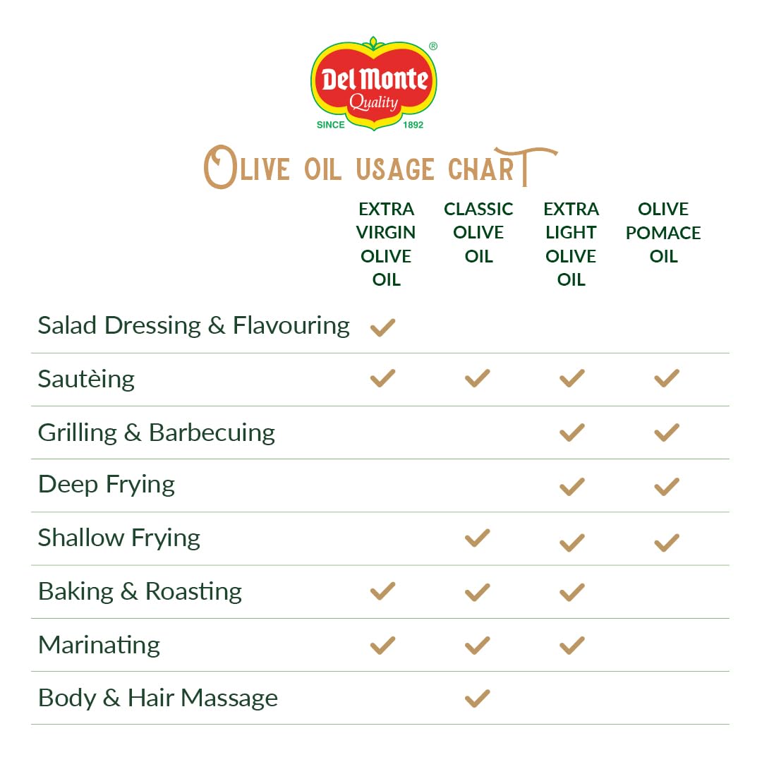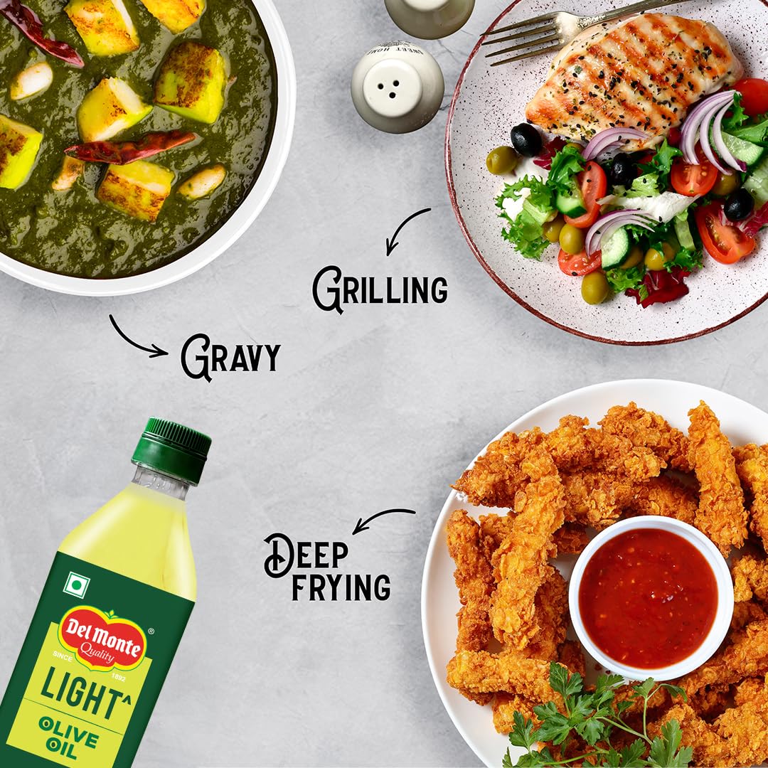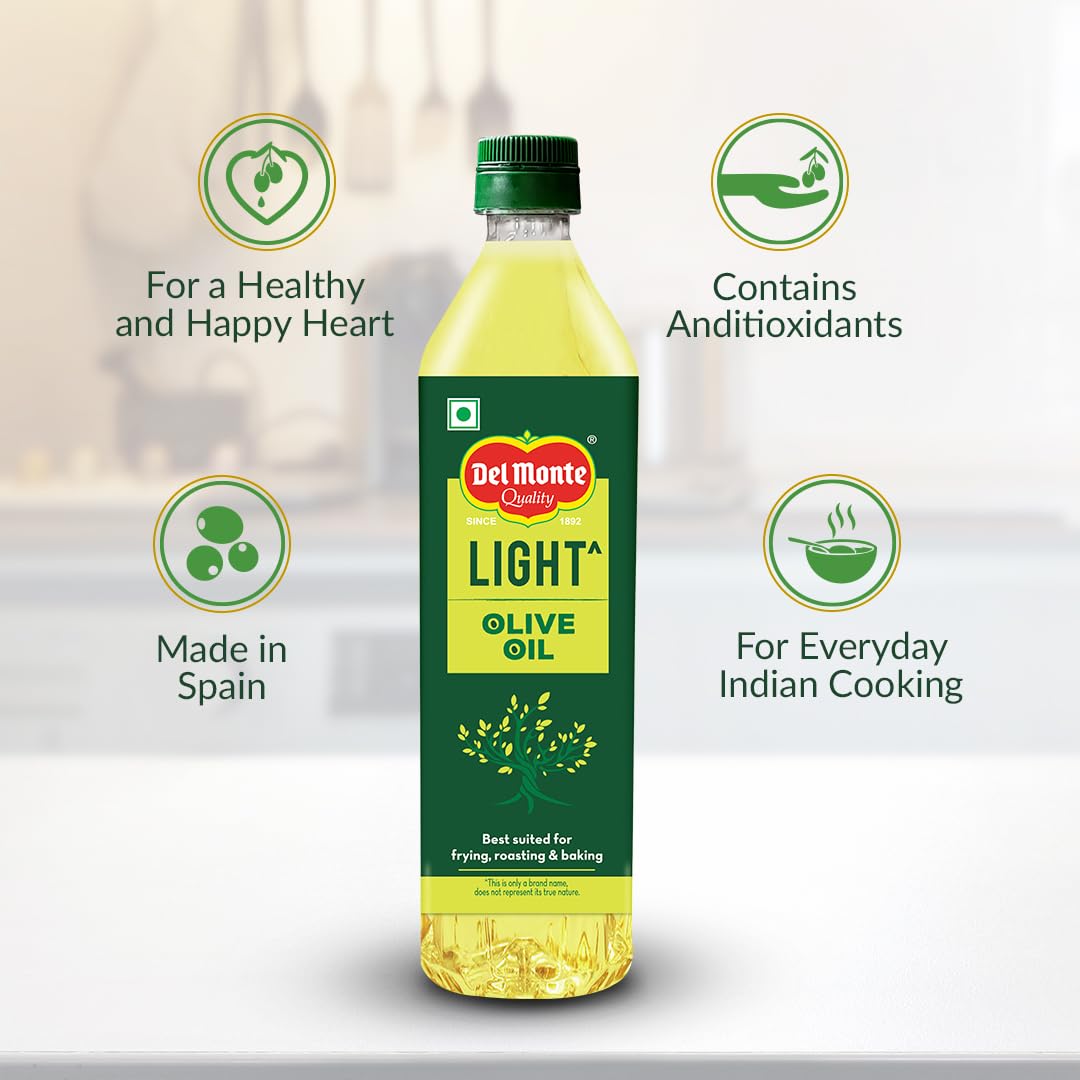 Del Monte Extra Light Olive Oil is distinguished by its light color and subtle taste. Has light flavor & aroma ensures minimal change in the taste of preparation. It is suitable for everyday Indian cooking- from making chapattis paranthas gravies to sauteing deep frying & baking. It preserves the natural flavour of food.