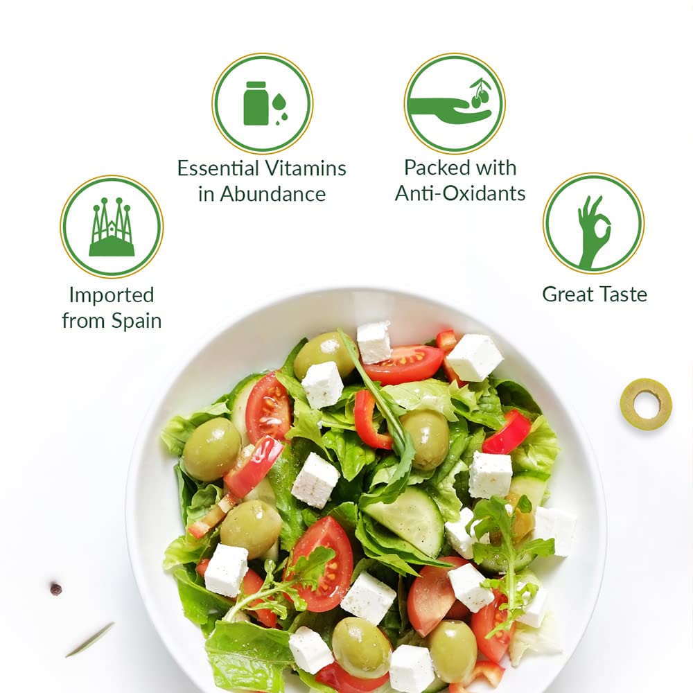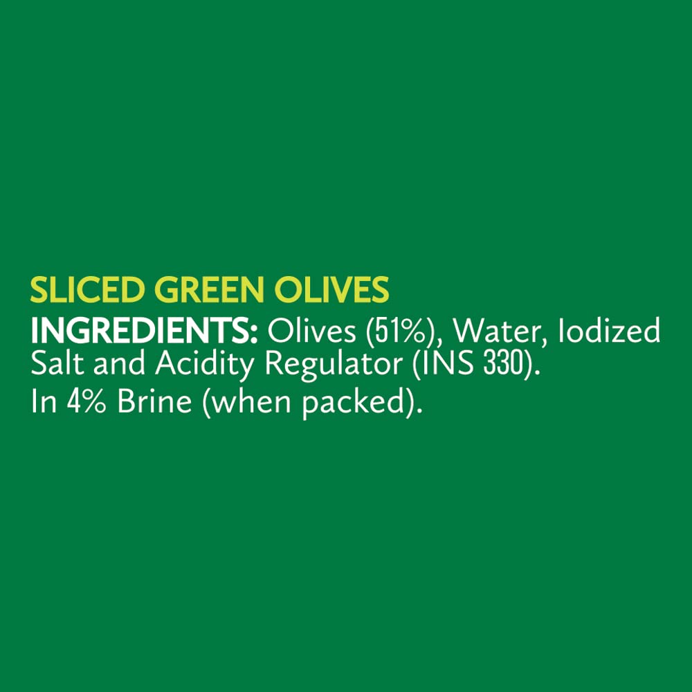 Del Monte Green Sliced Olives 450g l Imported from Spain | Low Fat Ready-to-Eat Healthy Snack l 100% Natural and Cold Extracted | Enjoy as toppings and in Continental cuisines