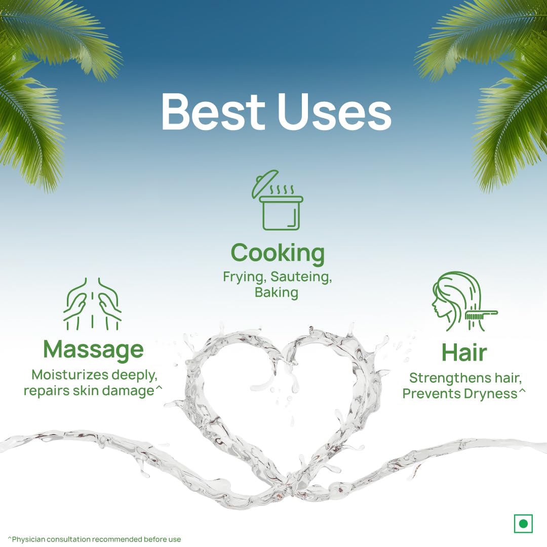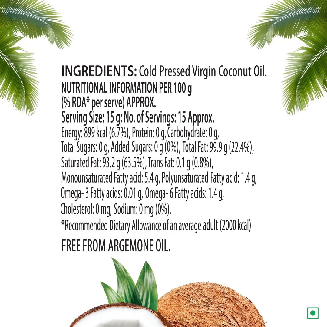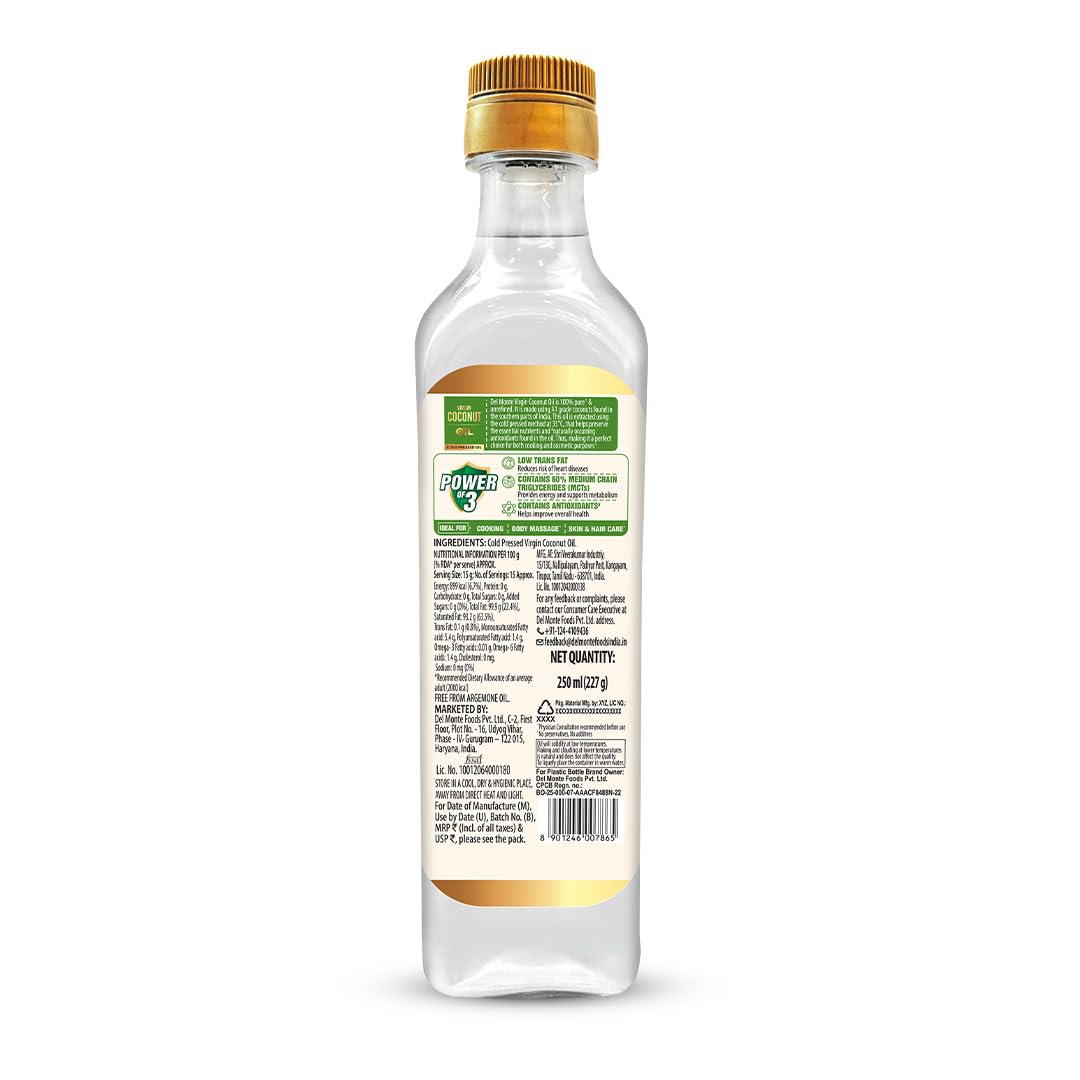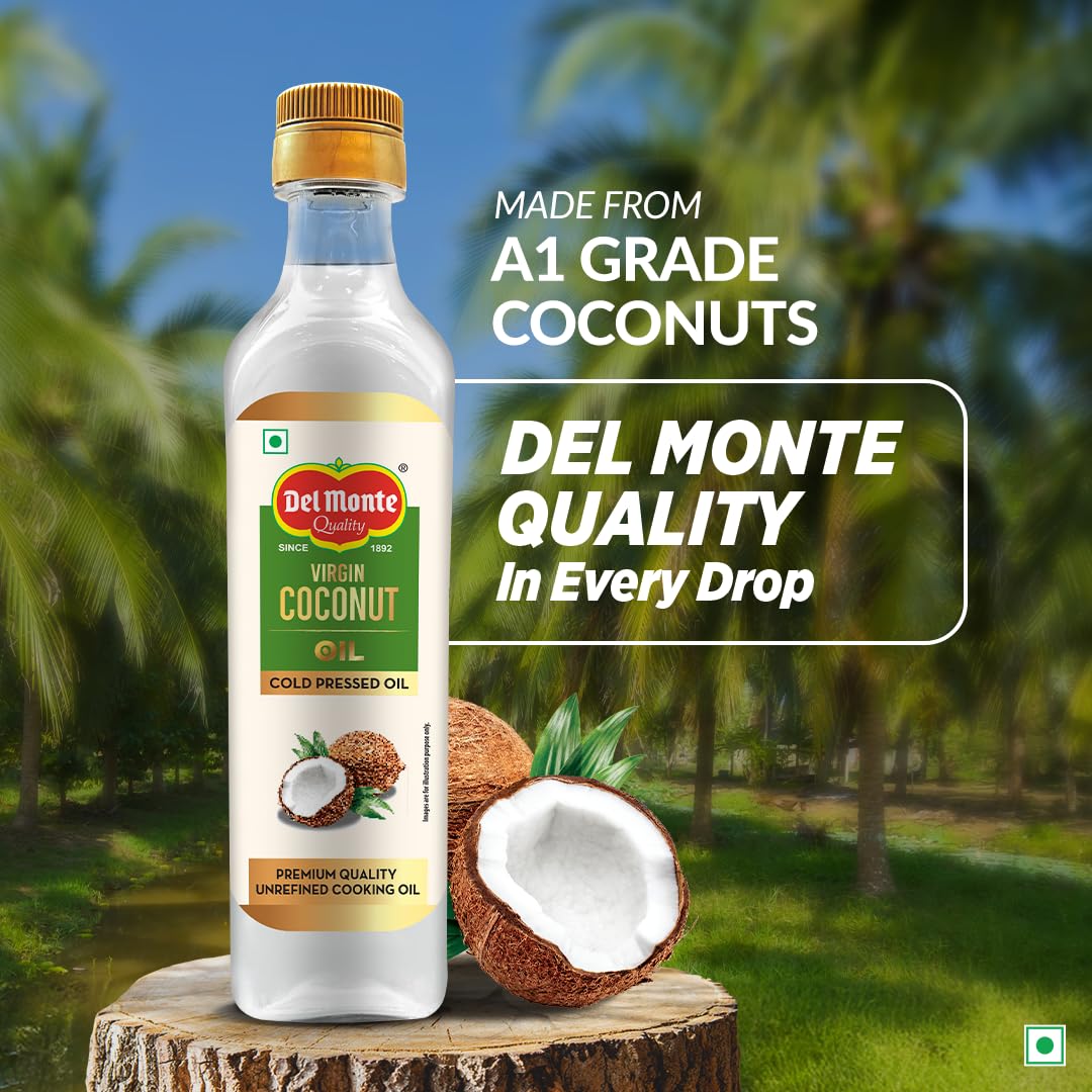 Del Monte Virgin Coconut Oil is 100% pure and unrefined. It is made using A1 grade coconuts found in the southern parts of India. This oil is extracted using the cold pressed method at 35 °C that helps preserve the essential nutrients and naturally occurring antioxidants found in the oil. Thus making it a perfect choice for both cooking and cosmetic purposes.