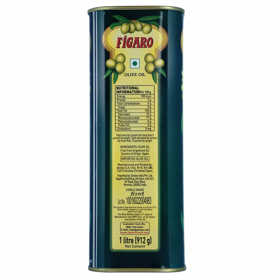 Figaro is the oldest olive oil brand in India with 100 years of legacy. We are committed to quality and health and thus we are constantly evolving to bring you a olive oil experience. Every can of Figaro comes with an assurance of purity - only the finest quality olives are used and great care is taken to ensure that the oil retains all its nutritional benefits. Enriched with the goodness of Vitamin E every drop of our healthy olive oil is pure and primed. Figaro olive oils are o a godsend to your levels and maintain the cardio-circulatory system. Matters of the are just better with Figaro Olive Oil. But that's not all! From maintaining a healthy to helg you shed those extra pounds our oils are extracted without any harmful itives like Argemone oil so you can rest assured that they are the perfect dietary ition for your most precious people. The best part is that it can enrich all your favourite dishes ranging from an effortless Omelette a quick Bhindi Fry some exotic Pasta Penne a masterful grilled Eggplant a healthy Sprouts Salad or even baking some Pizza Bread! So whether you're planning a perfect meal with the delectable aroma of fresh olives or worried about that growing tummy you k now you can trust Figaro Olive Oil to make it right. Container Type : Tin