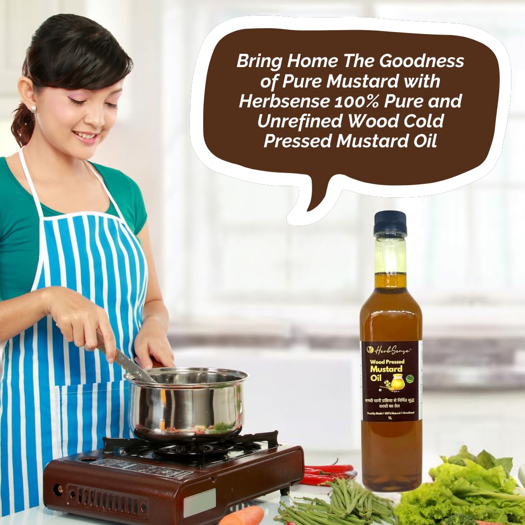 Herbsense Wood Pressed Mustard Oil is 100% Pure Made in small batches with an aim of replacing refined oils in every Indian household by providing them with natural and real oil that is full of nutrients and beneficial for health. Wood Pressed Mustard Oil is the healthiest choice for stir-frying and making sabzi like bhindi gobi aloo and beans. Wood Pressed Mustard Oil is the healthiest choice for frying because it has a high point. Mustard Oil can be used to fry Samosa Pakoda etc.