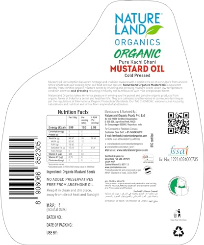 Usage of mustard oil kachi ghani shares the fate of a broken trust. With changing time our oil changed leading to many diseases and unhealthy life style. Thanks to paid media and paid news which promoted refined oils imported brands and what not. Kachi ghani mustard oil consumption has a rich heritage and tradition involved with it and it the oil of our culture from ancient times which suits our cooking style our food and our culture. Mustard oil stimulates the appetite by increasing salivation by up to eight times. Mustard oil still remains the best oil for cooking with its high smoking point and always will be with its balanced nutrition profile and if it organic; it an added advantage. Our kacchi ghani processed organic filtered mustard oil is far better than a solvent extracted refined oils. It has distinctive pungent taste which imparts its goodness to the food we cook in it. We are not using any preservative in the oil oil is itself a preservative why any preservatives will be required to be added to mustard oil. We extract this mustard oil from wooden expellers and no antifoaming agent is added to the same. Cold pressed means expelling the oils by pressing the same with wooden expellers not with any machine or steel or iron machine and the oils expelled by wooden expellers is done on very low rpm (rotation per minute) which does not generates any extra heat during processing of oil to maintain its good nutritional value. These are desi and hybrid mustard seeds but not gmo/genetically modified seeds.