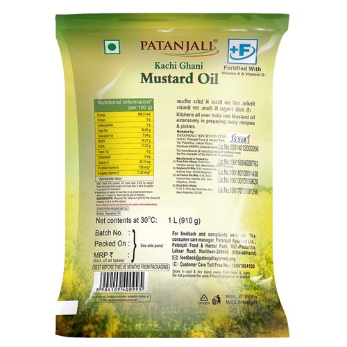 Patanjali Kachi Ghani Mustard Oil refers to cold press extraction process for taking out oil from seeds. Sarso Oil from seeds was extracted in kohls. In this process, seeds are crushed at a low temperature so natural properties, antioxidants, and essential oils are retained in the oil.Oil of Mustard seeds. Free from Argemone oil. Kitchens all over India use Mustard oil extensively in preparing tasty recipes & pickles. Mustard oil is fully with the omega 3 which is necessary for our health.It will make your digestive system strong and healthy.* Mustard oil is highly recommended for the reason that it is full of monounsaturated fatty acids (MUFA).* According to a study done by the American Journal of Clinical Nutrition, including mustard oil in your regular diet could prove to be beneficial to your heart health.* Mustard oil has anti-bacterial, anti-fungal and anti-viral properties. Its external as well as internal usage is said to help in multiple ways to fight against infections, including digestive tract infections.* Mustard oil, because of its anti-microbial properties, it is used as a preservative for pickles.*Mustard oil has oleic acid and linoleic acid which are essential fatty acids that make it a good hair tonic. Hair massage with this oil is said to increase blood circulation and promote hair growth.Mustard oil