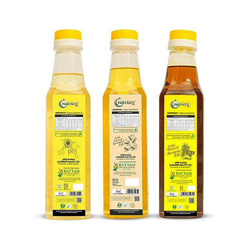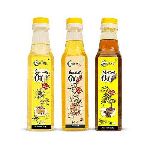 Nutriorg Cold Pressed 100% Organic Mustard, Sunflower & Groundnut Oil (Pack of 3 * 500 ml ) | Essential Cooking Purpose | Unrefined | Natural Filtration for Nutrients Retention