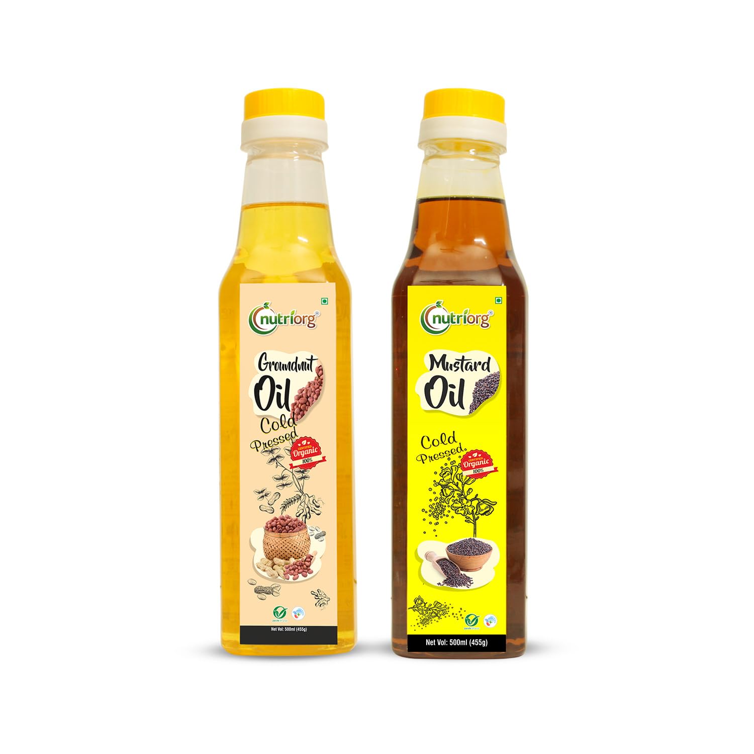 Nutriorg Organic Mustard & Groundnut Oil (Pack of 2 * 500 ml) | Cold Pressed | Wooden Pressed | Essential Cooking Purpose | Unrefined | Natural Filtration for Nutrients Retention| Hair & Skin Care