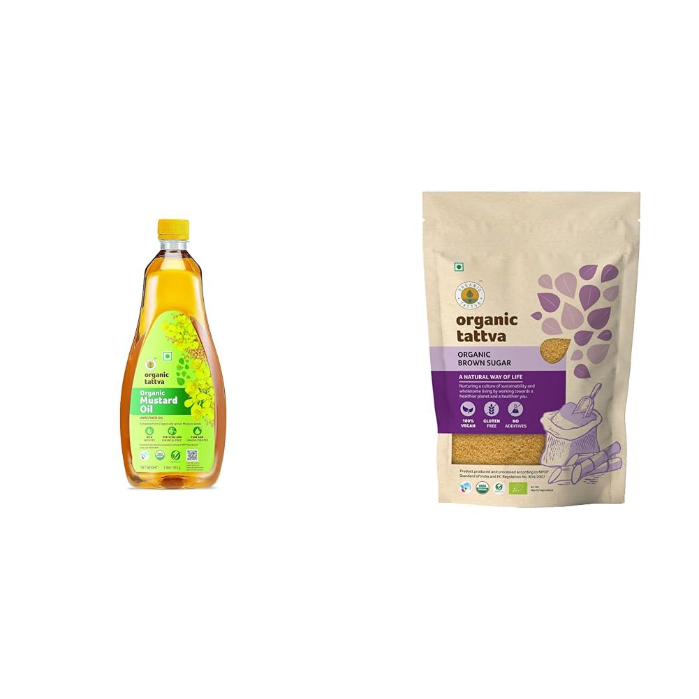 Organic Tattva Organic Unrefined Mustard/Sarso Cooking Oil (1L)Sign of purity.Organic Tattva All Natural Brown Sugar Zero Chemicals Organically Processed from Freshly Squeezed Sugar Cane Juice and Enriched with Essentials Nutrients (1 Kg Pouch)Our Mission: Our brand mission is to help people live a healthier wholesome life by providing them with a variety of 100 percent certified authentic organic foods. We value honesty integrity and continual self-improvement. We are committed to a sustainable environment zero-additive foods and complete customer-satisfaction. Brand philosophy: The brand organic tattva is based on the principles of health ecology fairness and care. At organic tattva the team works with accredited organic farmers who do not use fertilizers pesticides and genetically modified seeds so that their consumers can enjoy the benefits of nature and relish nutritious healthy pure and chemical-free food an important factor contributing to overall wellbeing.