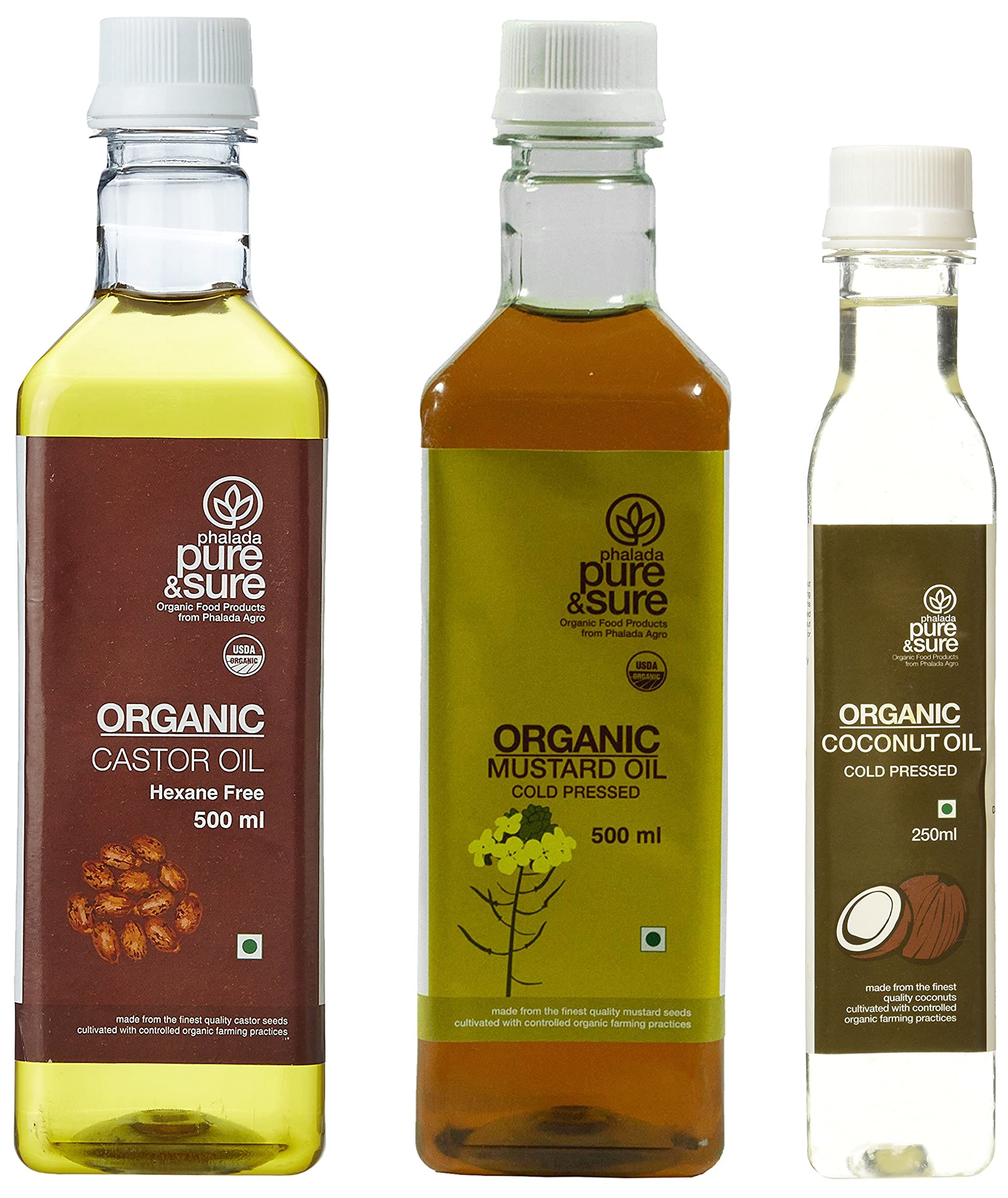 Pure & Sure Organic Castor Oil 500ml | Hexane Free Castor Oil | Castor Oil Cold Pressed Edible | Castor Oil for HairMade from the finest quality castor seeds sourced from certified organic farms across India phalada pure & sure Organic Castor Oil is a natural emollient that is also known for its laxative properties.Pure & Sure Organic Mustard Oil 500mlMade from the finest quality products cultivated with controlled organic practices.Pure & Sure Organic Coconut Oil 250mlPhalada Pure and sure is a range of certified organic food products stemmed from our aim of providing complete solutions across organic supply chain. By offering end consumers quality organic food products which are sourced directly from farmers we make sure our involvement in the supply chain from farm to hands. Our products guarantee purity and reach your hands without the use of chemical fertilizers additives or artificial ingredients. We go one step further to satisfy our customers: In areas where our supplies are limited we source premium organic products from across the globe and deliver a complete range of pure products that sure serves you the best. By sowing our vision we harvest quality and spread healthy organic practices.