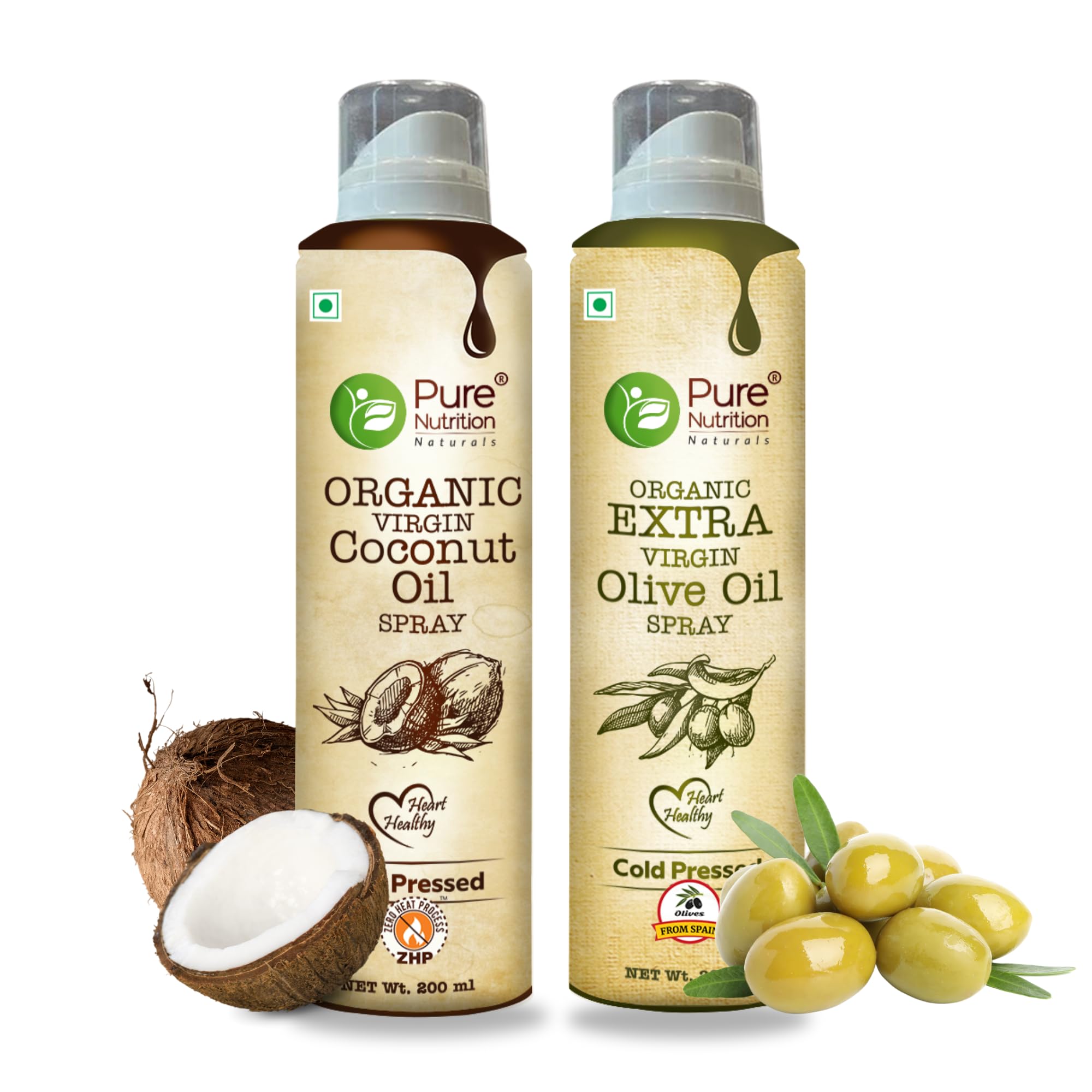The Pure Nutrition Combo Pack features 200ml of premium 100% organic Virgin Coconut Oil and Virgin Olive Oil Spray. The coconut oil offers a rich tropical flavor with a high smoke point perfect for baking and sautéing. The olive oil spray allows for low-calorie cooking by using up to 10 times less oil making it ideal for light frying dressings and air-frying. Both oils are free from synthetic pesticides and fertilizers ensuring a healthier more natural choice for your kitchen.