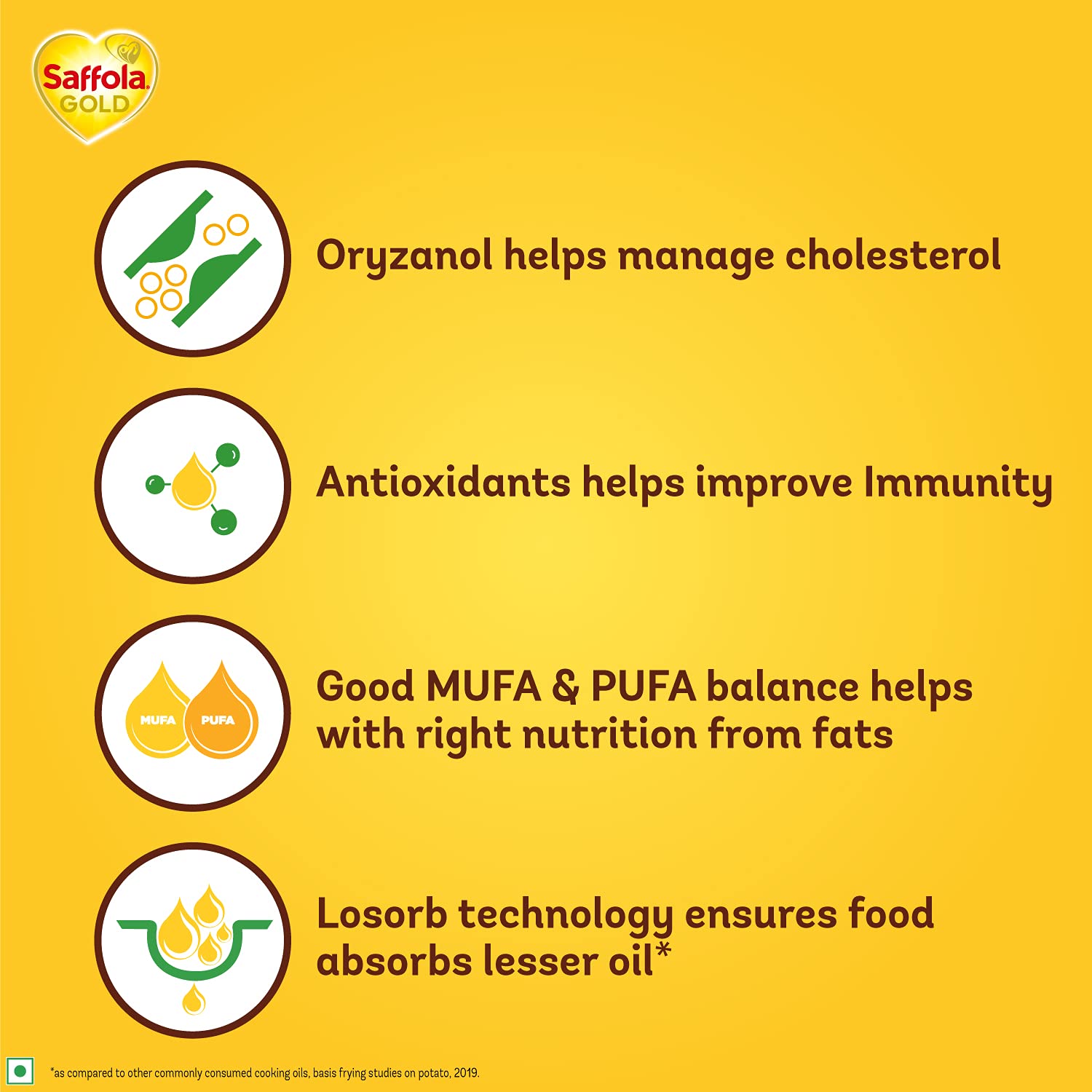 We understand that your family's health and your health is ever so important for you. And we also understand that it's not easy. Today our food habits stress & activity level affect our health. And without realising it our heart health too. Did you know that to keep our body functioning well and healthy it is important to keep our heart healthy? That's because the heart is the control room of the body. A healthy heart is among the first steps to overall health. So it is not about taking care when a problem arises but ensuring you take small steps today to take pro-active care of your heart and health. The easiest step is to switch to foods that are healthier for your heart. And choosing the right cooking oil can help make your meals better for your heart and health. Saffola Gold multisource edible oil can help keep your family heart healthy. This vegetable oil has a good balance of MUFA & PUFA with a specially designed anti-oxidant system that helps improve immunity. Saffola Gold with Oryzanol helps maintain healthy cholesterol levels. Saffola Gold cooking oil comes with LOSORB™ technology which results in upto 33%* lesser oil absorption in food. So choose Saffola Gold that's better for you because it is better for your heart! Saffola encourages you to follow a balanced diet & active lifestyle. *as compared to commonly consumed cooking oils; basis frying studies on potato 2021.