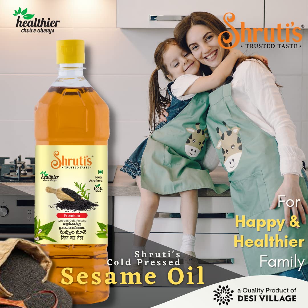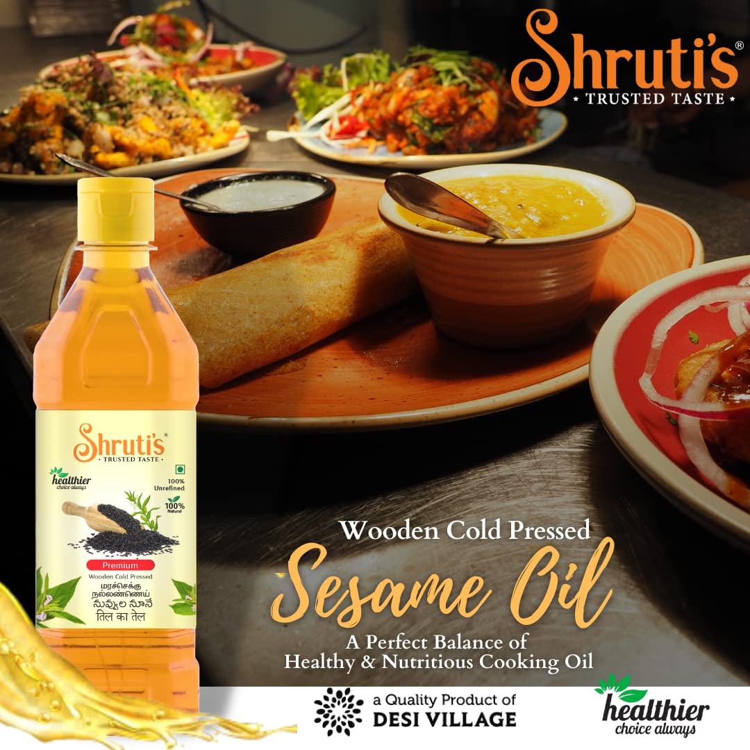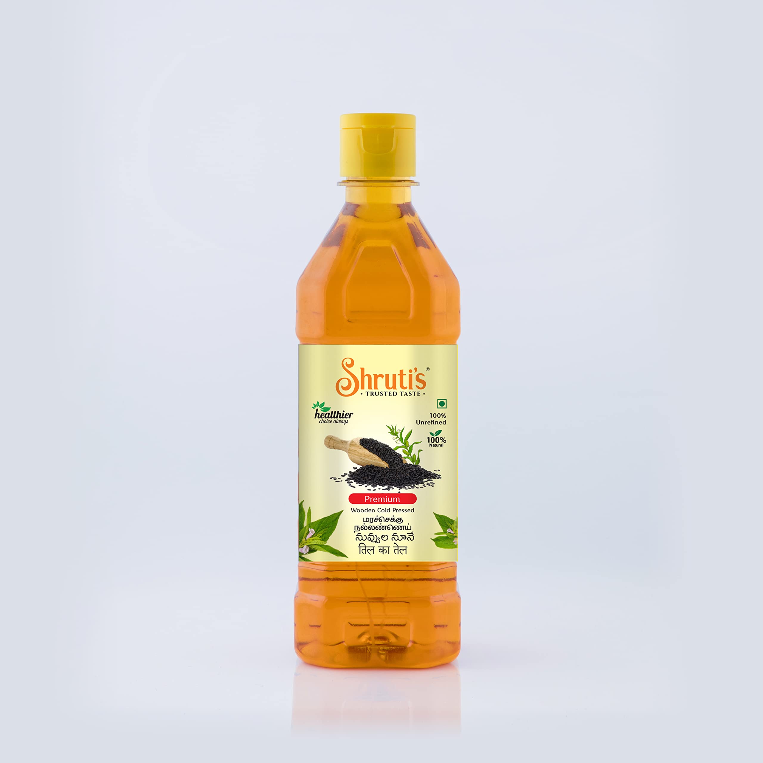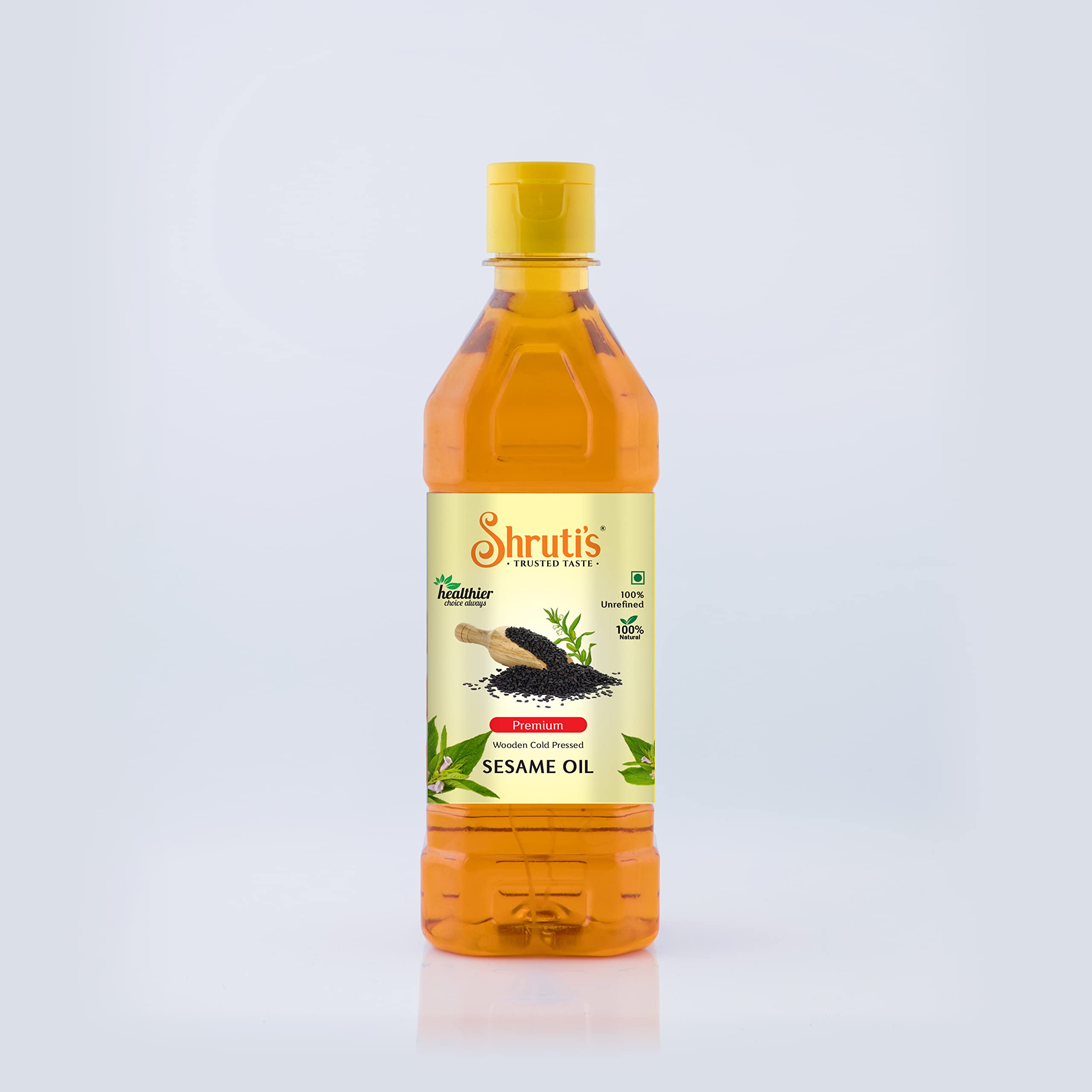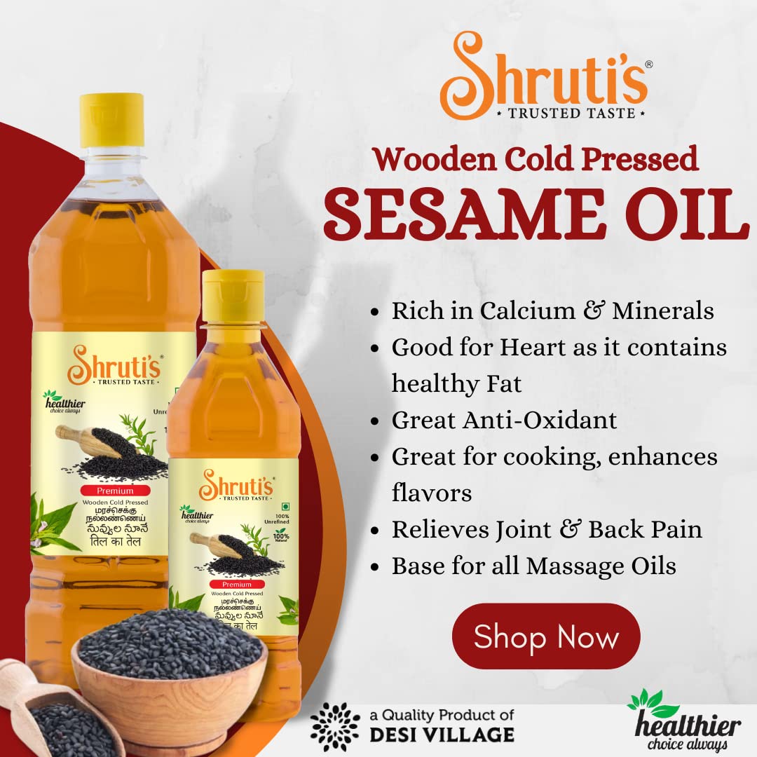 In most Indian households you will often find a bottle of sesame oil stored in the kitchen shelf for special recipes. Also sesame oil is valued for its medicinal properties. It is said to be good for the skin and often used for massages as it penetrates deep into the skin to provide nourishment and helps to relieve stress. Shrutis sesame oil is cold pressed in the traditional wooden press to save much of its nutritional values which are usually lost in modern pressing and refining.