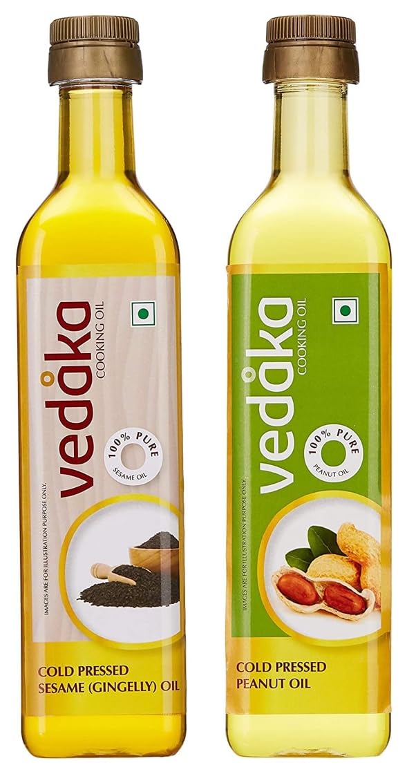 Vedaka Cold Pressed Sesame (Gingelly) Oil Bottle 500ML100% Pure unadulterated oil ensured by the fatty acid profiling process extracted through no heat Process to preserve natural goodness.Vedaka Cold Pressed Peanut (Groundnut) Oil Bottle 500MLVedaka products undergo rigorous and stringent laboratory tests to conform to the standards set by Food safety and standards authority of India (fssai). all our packs are hygienically packed while maintaining quality standards.