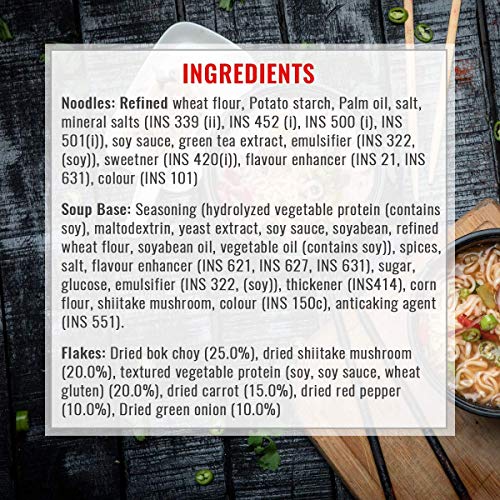 Ingredients : Noodles : Refined Wheat flour Starch palm oil salt seasoning yeast extract soy sauce garlic maltodexin) Mineral salts (INS452 (i) INS501 green tea extract colour (INS 101)