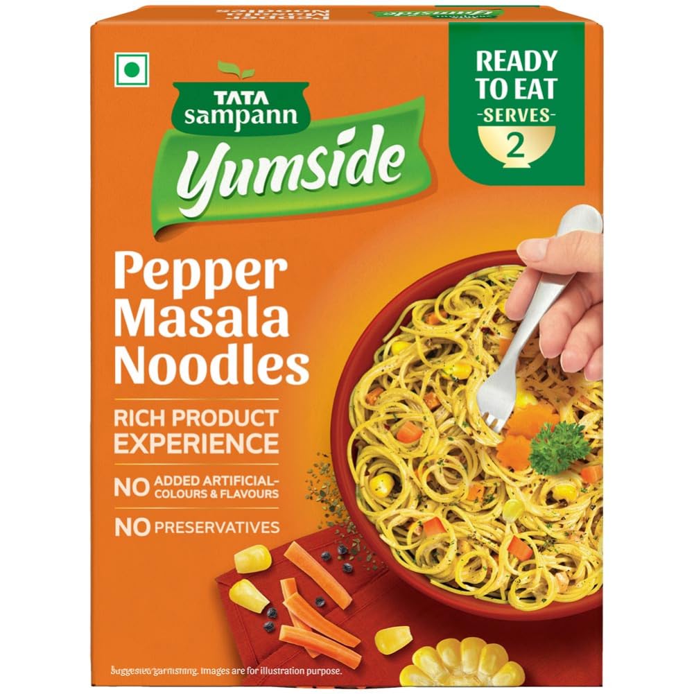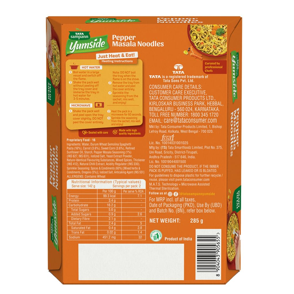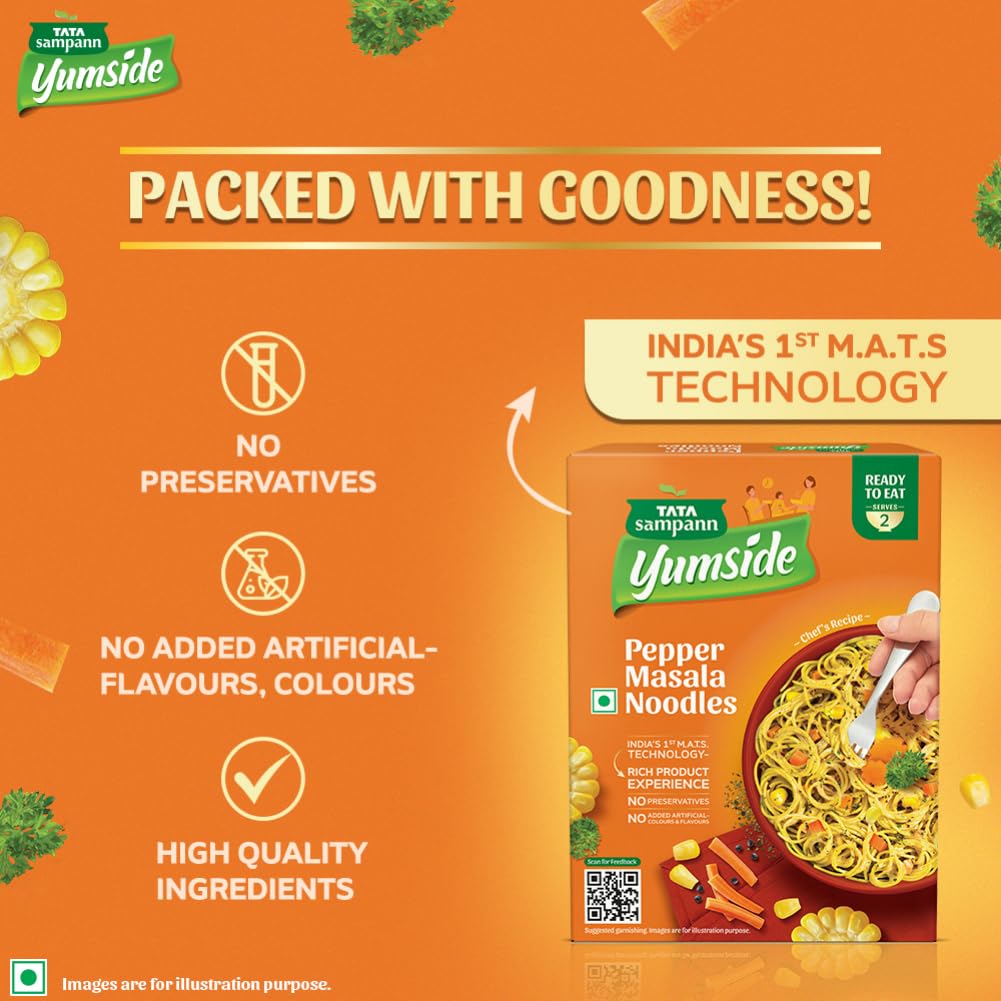 YUM MEAL WITH GOODNESS - An instant solution to your cravings! Looking for an instant and convenient way to kill those hunger pangs? Your search ends with Tata Sampann Yumside ready to eat meals which are made from high-quality ingredients and curated by professional chefs. Loaded with Corn Carrots and with a zing of Pepper these Pepper Masala Noodles will satisfy your Noodle cravings anytime! For times when you or your family crave something delicious for lazy days for treat days for days when you're running out of time for days when you just want to have more time for life! - This ready-to-eat meal comes to the rescue. All you have to do is heat the pack in the microwave for 60 seconds or immerse the tray in hot water for 3-5 mins and your instant meal is ready! Doesn't it sound great? Sprinkle the seasoning from the sachet mix well and enjoy! Enjoy a rich experience Tata Sampann Yumside ready-to-eat instant noodles are sealed with care using India's first Microwave Assisted Thermal Sterilization (M.A.T.S) Technology to offer you a rich product experience. For a delicious twist sprinkle the mixed herb seasoning provided with the pack. Storage Instructions: Store in a cool and dry place. It does not require refrigeration. Consume immediately once the pack is opened. Do not consume if the inner pack is puffed bloated or leaked.