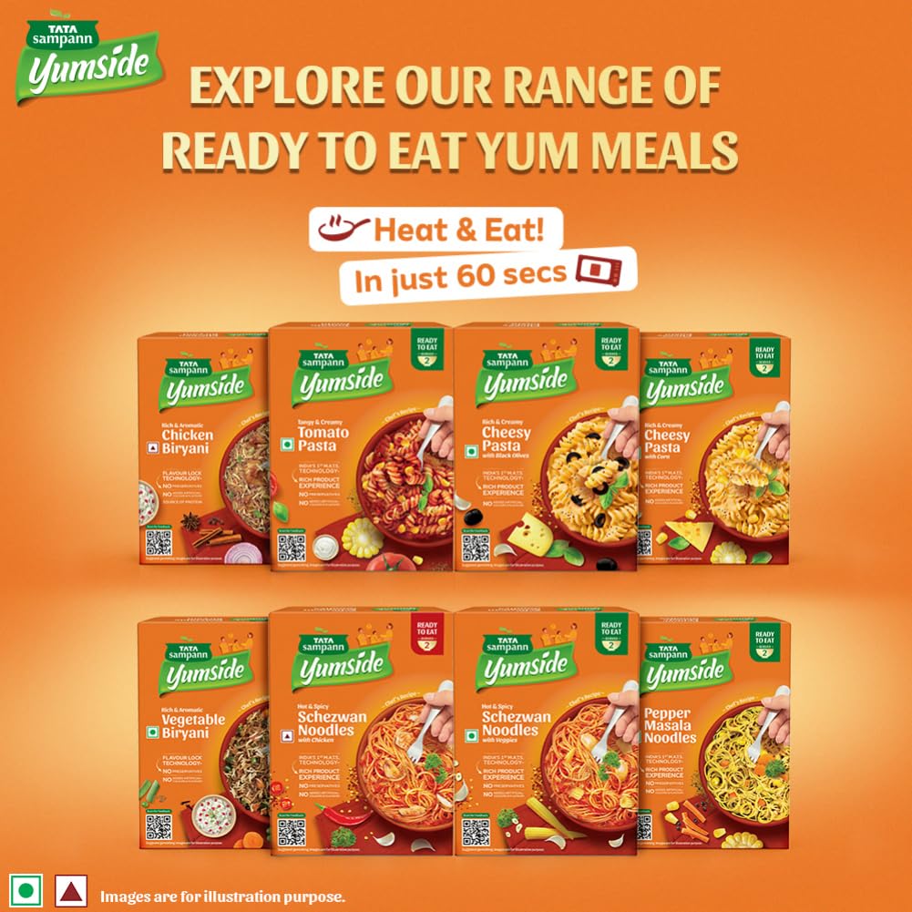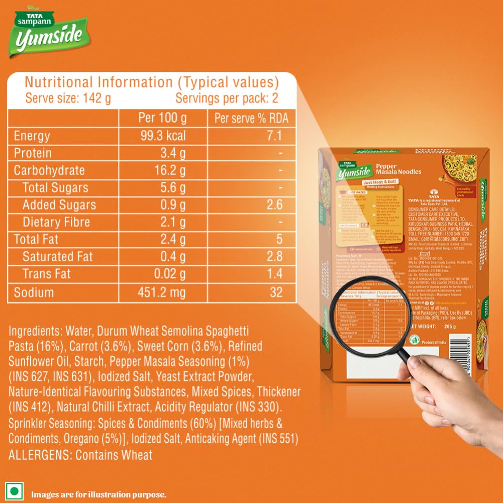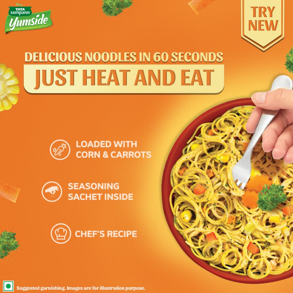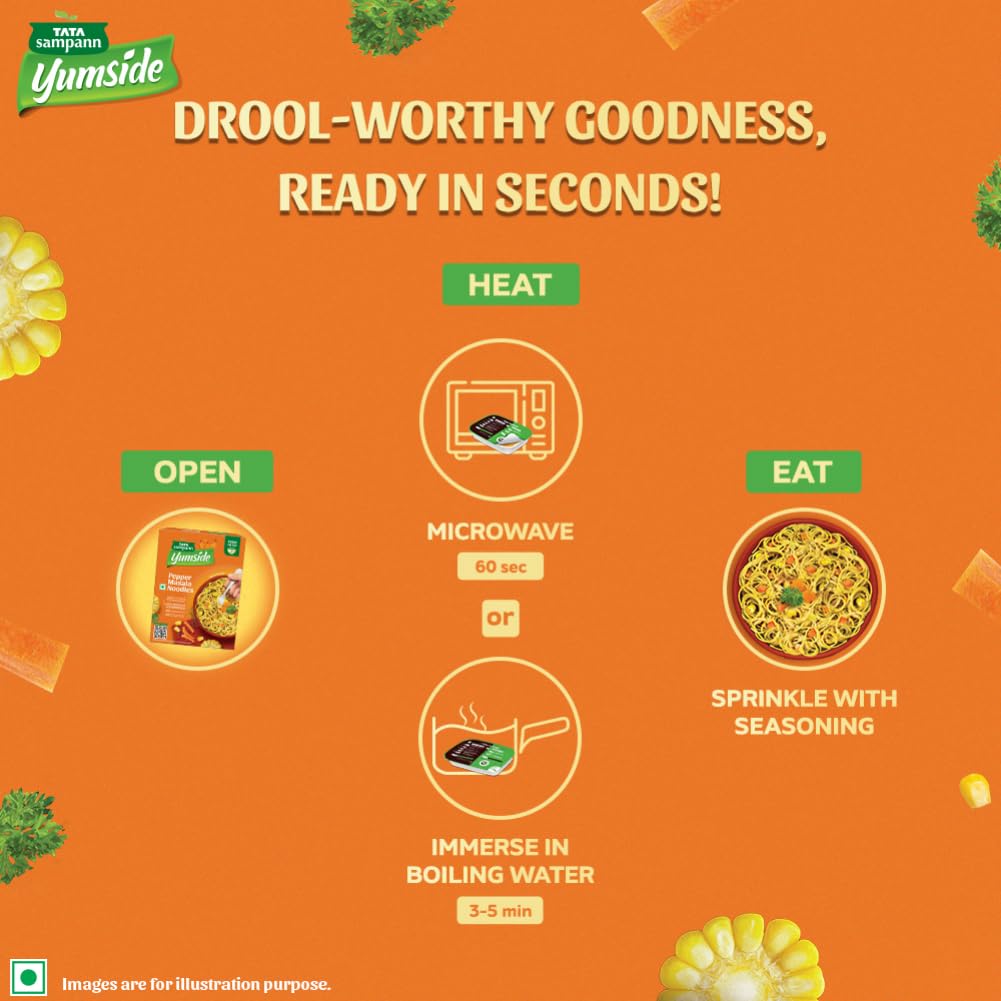 YUM MEAL WITH GOODNESS - An instant solution to your cravings! Looking for an instant and convenient way to kill those hunger pangs? Your search ends with Tata Sampann Yumside ready to eat meals which are made from high-quality ingredients and curated by professional chefs. Loaded with Corn Carrots and with a zing of Pepper these Pepper Masala Noodles will satisfy your Noodle cravings anytime! For times when you or your family crave something delicious for lazy days for treat days for days when you're running out of time for days when you just want to have more time for life! - This ready-to-eat meal comes to the rescue. All you have to do is heat the pack in the microwave for 60 seconds or immerse the tray in hot water for 3-5 mins and your instant meal is ready! Doesn't it sound great? Sprinkle the seasoning from the sachet mix well and enjoy! Enjoy a rich experience Tata Sampann Yumside ready-to-eat instant noodles are sealed with care using India's first Microwave Assisted Thermal Sterilization (M.A.T.S) Technology to offer you a rich product experience. For a delicious twist sprinkle the mixed herb seasoning provided with the pack. Storage Instructions: Store in a cool and dry place. It does not require refrigeration. Consume immediately once the pack is opened. Do not consume if the inner pack is puffed bloated or leaked.