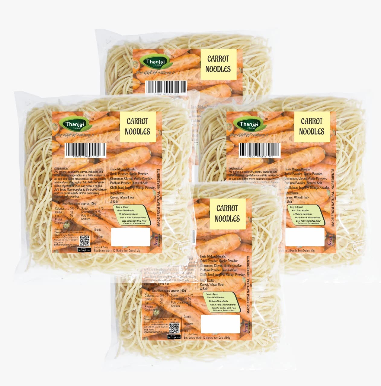 Carrot Noodles pack is preservatives free; no maida; no artificial flavors and colors; no chemical; delicious tastemaker included in the pack... Easy and Instant - just cook the noodles for 5 minutes drain the hot water and rinse with cold water. Add some veggies of your choice in a little amount of oil and mix (Tastemaker) to it and mix thoroughly. Add the mixed vegetables to the boiled noodles mix well and serve hot to make it a wholesome delicious meal.