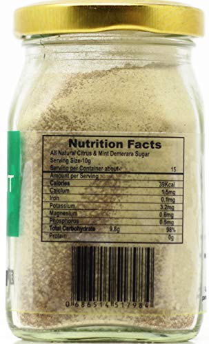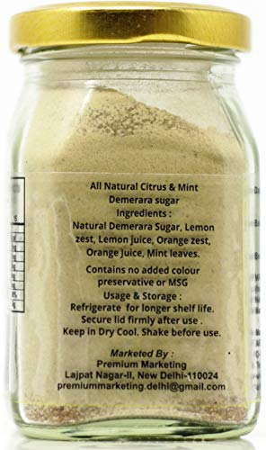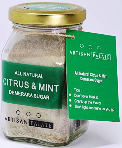All Natural Citrus & Mint Demerara Sugar are a natural combination. Real lemon, oranges and mint added to the Demerara sugar creates a clean and refreshing taste that is never bitter.Sweet: Dust Lemon sugar over sugar cookies or pound cake.Fresh: Add a dash of Lemon sugar to fruit salads.Savory: Mix with herbs and sea salt to finish off delicious roasted potatoes.Liquid: Rim a glass of unsweetened ice tea or use it in a MojitoTwist: Mix Lemon sugar with sea salt and season peanuts.Contains no added colour preservative or MSG
