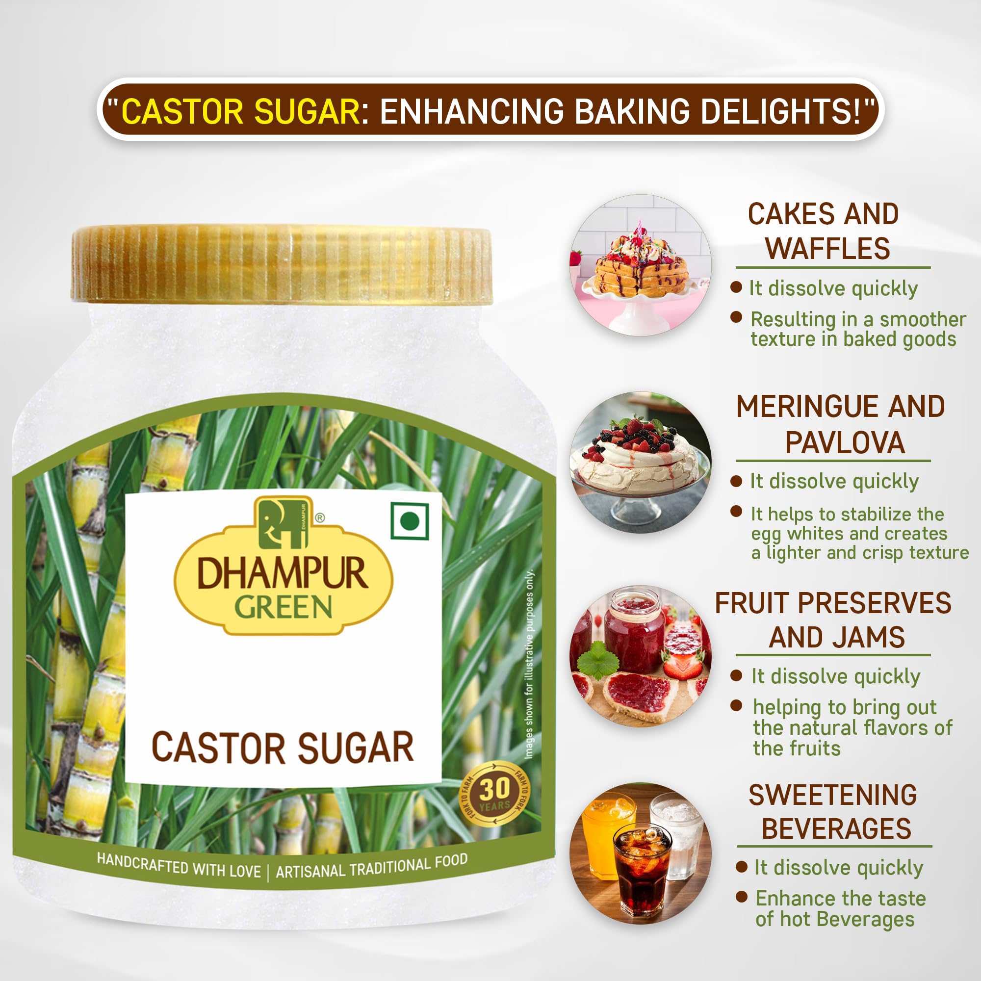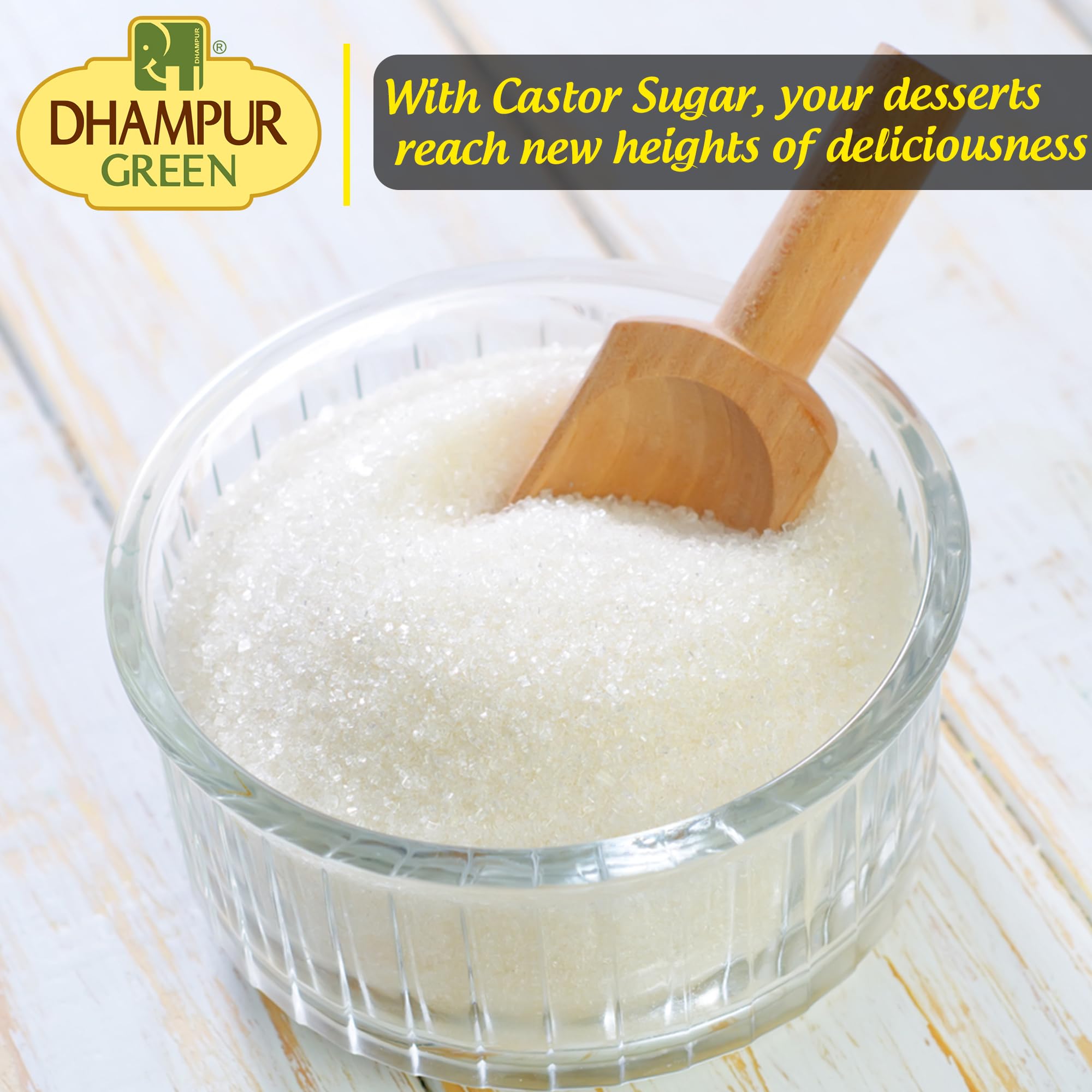 Dhampur Green Castor Sugar is a free-flowing sugar which dissolves instantly and is an ideal sweetener for baking using in beverages as well as for dusting/ garnishing. You can also use it to sweeten cold drinks whipped cream yogurt fruit purees and sauces. Its fine grind provides a smooth soft finished texture. Also known as Caster sugar. Castor Sugar may harden if not stored properly. Transfer contents from pack to an airtight container and keep in a cool and dry place. Never use a wet spoon to scoop out the sugar.