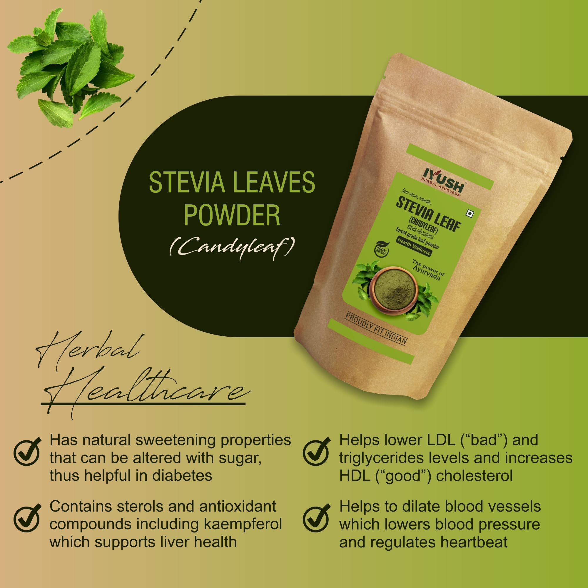 Stevia also known as Stevia rebaudiana is a natural herb that has been used in Ayurveda for centuries for numerous health benefits. It is an organic healthcare powder made from shade-dried wild forest grade Stevia leaves that contain the highest active nutrients grown naturally without any harmful chemicals or pesticides or fertilizers.