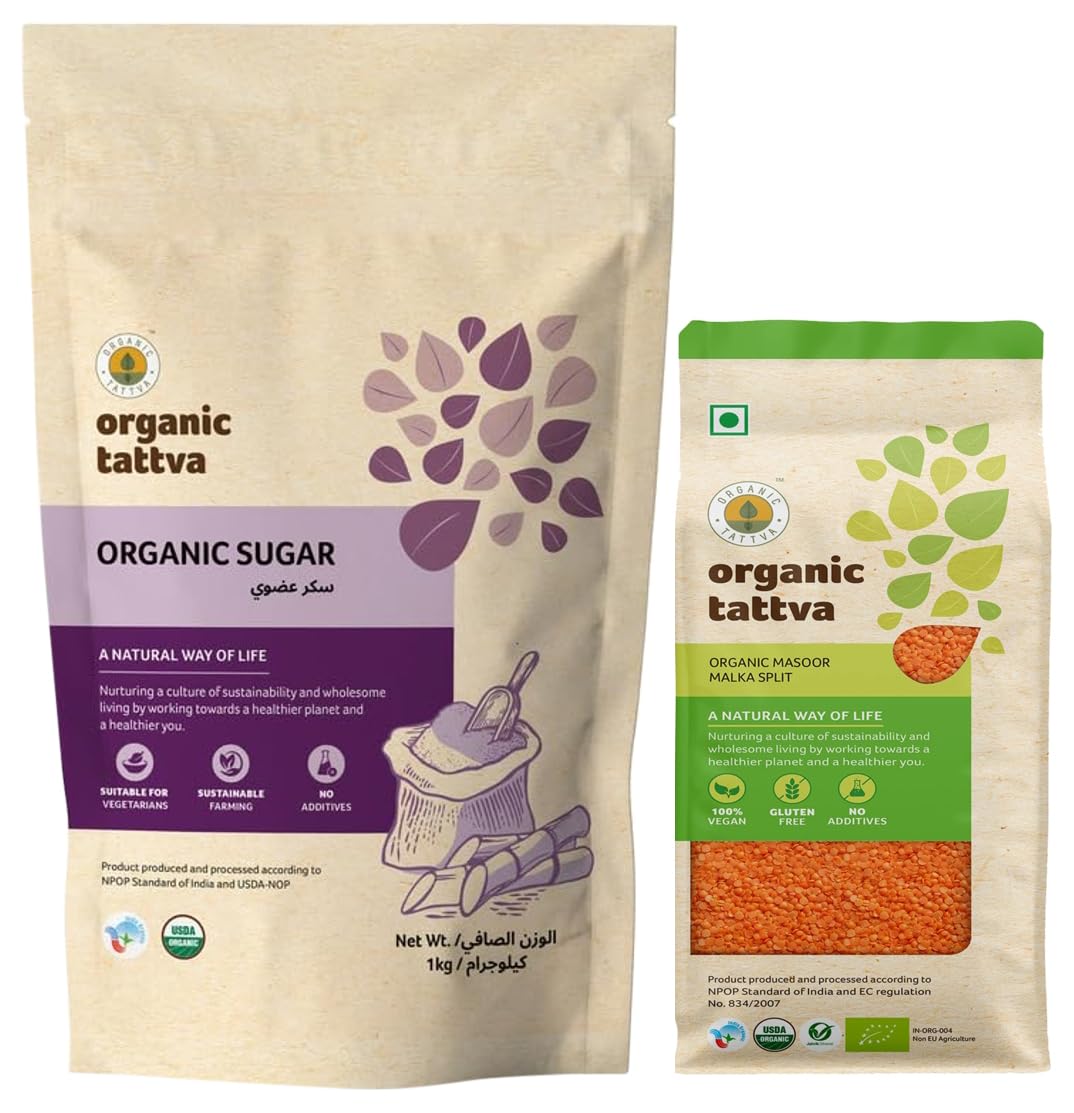 Organic Tattva All Natural 'Sugar' Zero Chemicals Organically Processed from Freshly Squeezed Sugar Cane Juice (1 Kg Pouch)Our Mission: Our brand mission is to help people live a healthier wholesome life by providing them with a variety of 100 percent certified authentic organic foods. We value honesty integrity and continual self-improvement. We are committed to a sustainable environment zero-additive foods and complete customer-satisfaction. Brand philosophy: The brand organic tattva is based on the principles of health ecology fairness and care. At organic tattva the team works with accredited organic farmers who do not use fertilizers pesticides and genetically modified seeds so that their consumers can enjoy the benefits of nature and relish nutritious healthy pure and chemical-free food an important factor contributing to overall wellbeing.Organic Tattva Masoor Malka Split 500gOur Mission: Our brand mission is to help people live a healthier wholesome life by providing them with a variety of 100 percent certified authentic organic foods. We value honesty integrity and continual self-improvement. We are committed to a sustainable environment zero-additive foods and complete customer-satisfaction. Brand philosophy: The brand organic tattva is based on the principles of health ecology fairness and care. At organic tattva the team works with accredited organic farmers who do not use fertilizers pesticides and genetically modified seeds so that their consumers can enjoy the benefits of nature and relish nutritious healthy pure and chemical-free food an important factor contributing to overall wellbeing.