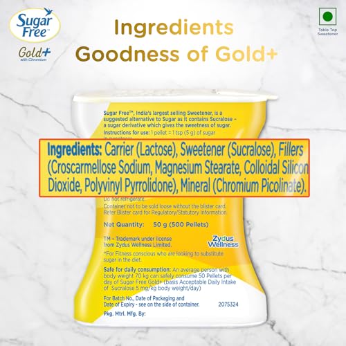 Sugar Free Gold, 500 Pellets| India s No.1 Sweetner| Sweet like Sugar with Low Calories| Scientifically Proven & Tested 50g