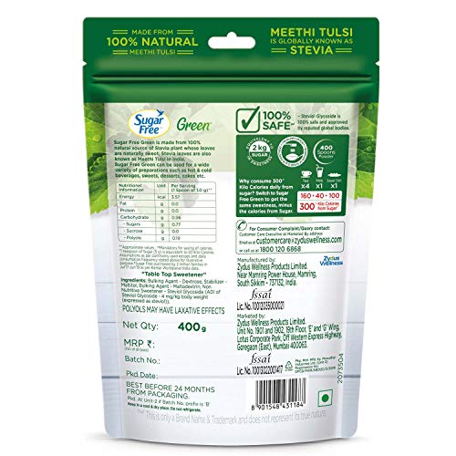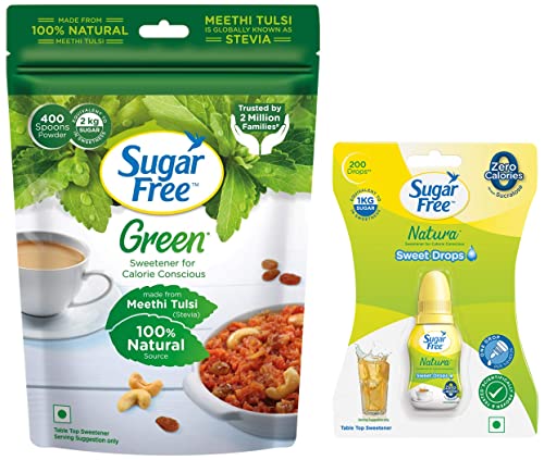 Sugar Free Green Stevia Powder Natural Stevia Powder - 400 g PouchSugarFree Green is made from 100% Natural source of Stevia plant whose leaves are naturally sweet. Stevia leaves are also known as Meethi Tulsi in India. Sugar Free Green adds sweetness to your dessert/beverage just like Sugar and helps save approximately 20 Calories for every 5 g of Sugar replaced with 1 g of Sugar Free Green Powder. Sugar Free Green can be used to prepare a variety of sweets and desserts as well as sweetening up any cold/hot beverage of your choice. With Sugar Free Green you can stop qorrying about any extra Sugar-calories while you indulge your sweet cravings.Sugar Free Natura - Sweet Drops 10mlIntroducing Sugar Free Natura sweet drops a liquid sugar substitute. It contains sucralose - the zero calories sugar substitute.