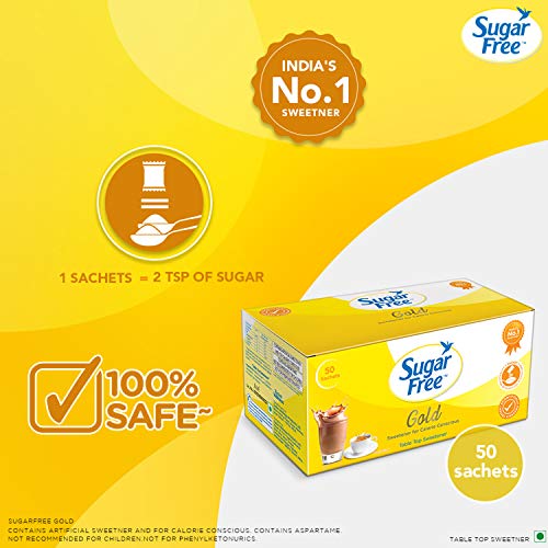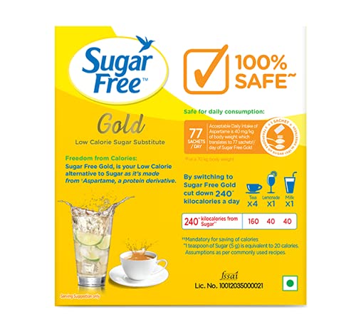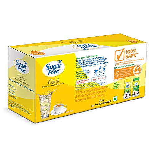 Sugar Free Gold is your healthier alternative to sugar. It is made from Aspartame a protein derivative. It is a nutritious safe and an ideal low calorie sugar substitute giving you the sweetness and taste of sugar but with negligible calories to worry about! Sugar Free Gold helps you to cut down on excess calories of sugar to keep you fit. While an hour of walk may help you to lose 350 calories (aprox.) by making Sugar Free a part of your fitness plan you can avoid 500 calories a day. Burning calories is difficult; avoiding them is easy with Sugar Free Gold. 1 sachet is equivalent in sweetness to 2 teaspoons of Sugar