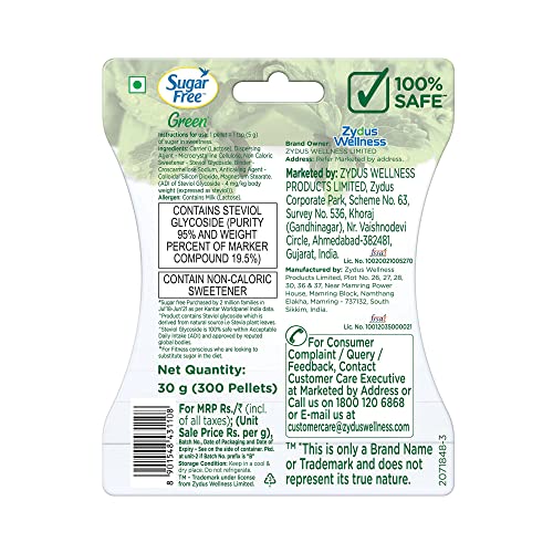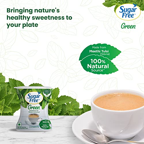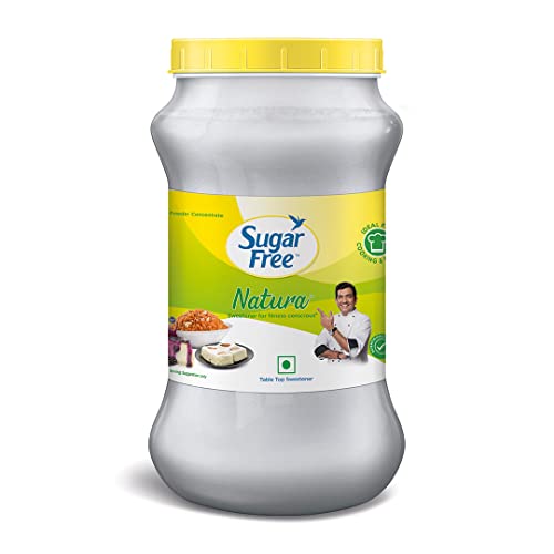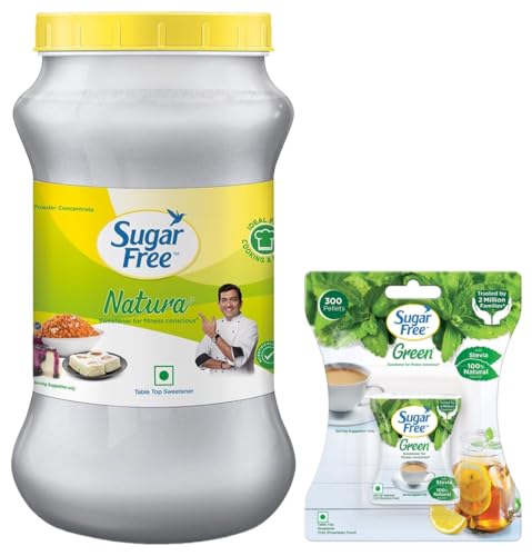 Sugar Free Natura Low Calorie Sweetner - 1kg JarSugarfree Natura made using Sucralose which is a derivative of Sugar. Sucralose tastes like Sugar but doesn't contain the same amount of calories. Thus it allows you to enjoy the sweet flavor of sugar without having to worry about gaining excess calories. Ideal for cooking and baking: Sucralose is highly heat stable which means you can cook and bake with it without any loss in sweetness. It can be used for making a wide variety of preparations- hot and cold beverages mithais desserts cakes etc. It is ideal for fitness seekers weight conscious & diabetics. 1 measured spoon (of 0.5 gms provided inside the pack) is equivalent in sweetness to 1 teaspoon of Sugar.Sugar Free Green 100% Natural Sweetener and Sugar Substitute - 300 Pellets net weight 30gSugar Free Green is made from 100% Natural source of Stevia plant whose leaves are naturally sweet. Stevia leaves are also known as Meethi Tulsi in India. Sugar Free Green is sweet just like Sugar and helps save approximately 20 calories for every 5g of Sugar replaced with 1 Pellet of Sugar Free Green. With Sugar Free Green you can stop worrying about any extra Sugar-calories while you indulge in your daily cup of sweet tea. Sugar Free Green can be used for a wide variety of hot & cold beverages.