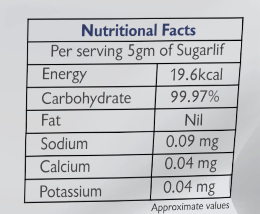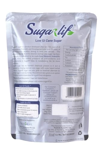 Introducing Sugarlif Low GI Sugar your go-to natural sweetener for a guilt-free and healthier indulgence. Crafted with a low glycemic index Sugarlif is designed to provide the perfect balance of sweetness without the blood sugar spikes associated with traditional sugars. Versatile and delicious it can be seamlessly incorporated into your favorite recipes beverages and desserts as a 1:1 substitute. What sets Sugarlif apart is its commitment to quality undergoing rigorous testing in leading l**********s across the United States and Canada. Make the smart choice for your well-being and savor the sweetness of life with Sugarlif Low GI Sugar where taste meets health seamlessly.