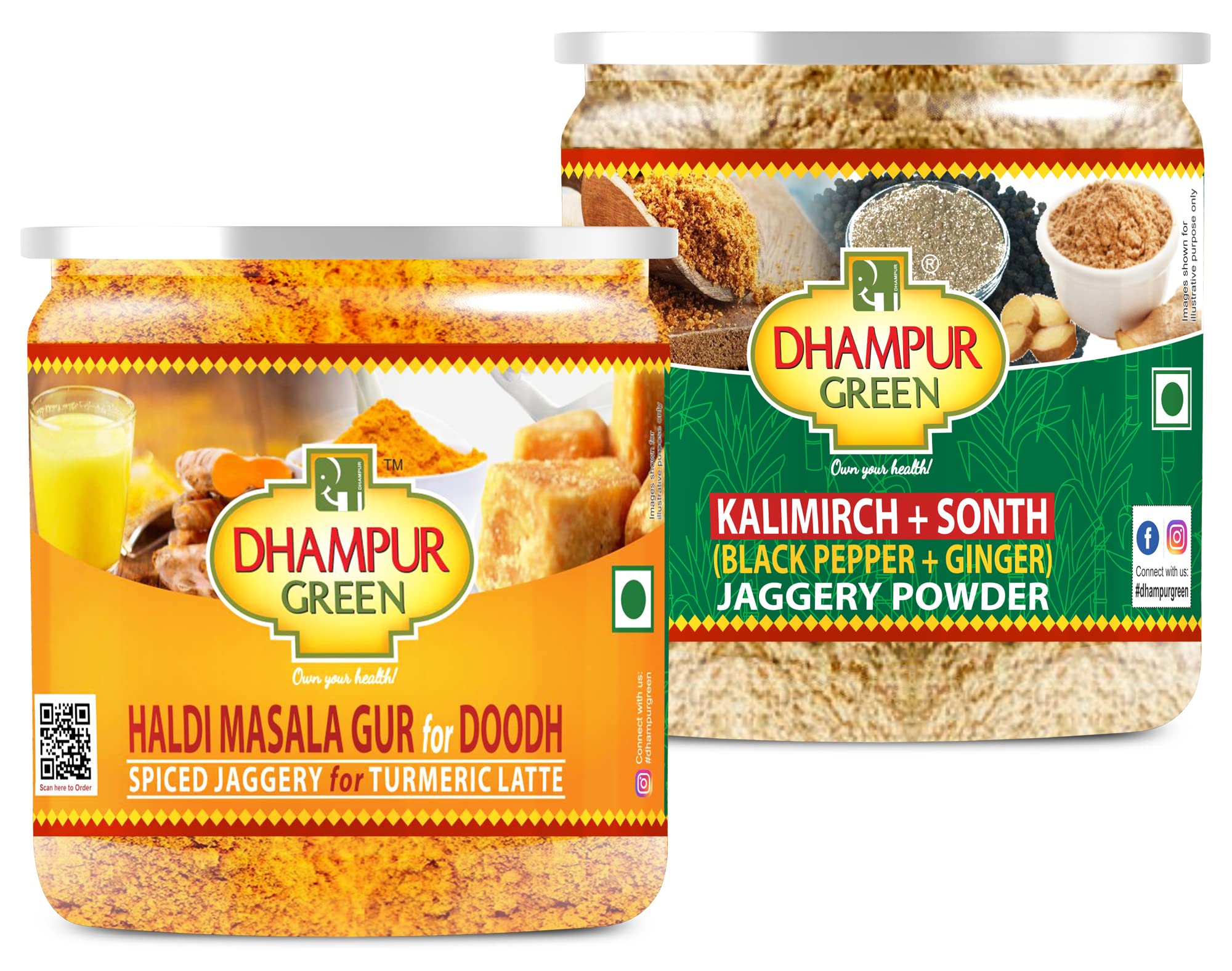 Dhampure Speciality Spiced Jaggery With Black Pepper & Ginger (Kali Mirch Sonth Ka Masala Gur) And Turmaric Latte Combo, 550G