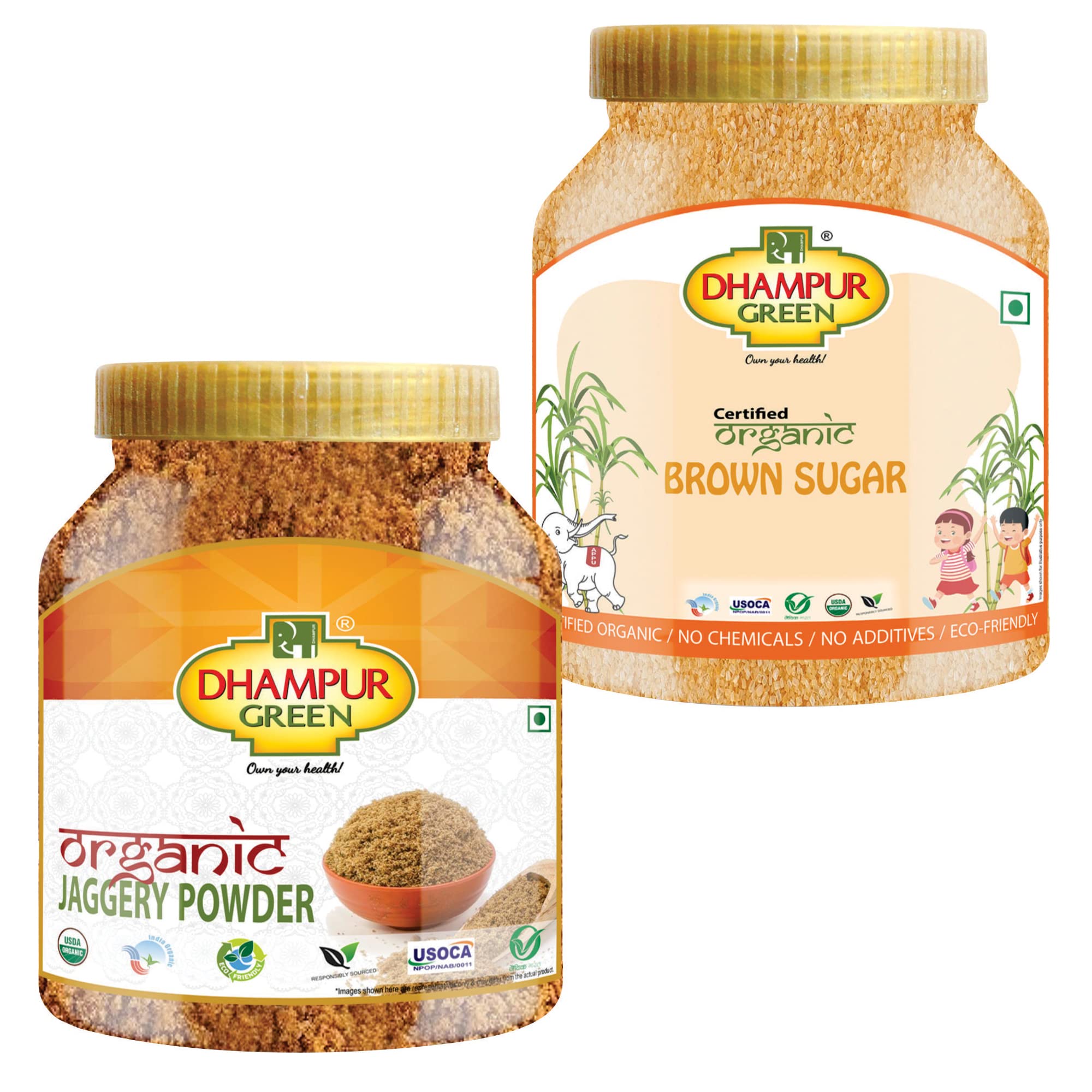 This certified organic evaporated sugarcane juice i.e. Pure Desi Shakkar/ Natural Jaggery Powder by Dhampur Green is made from finest quality naturally sun-ripened nutritious sugarcane in an FSSAI approved facility! This wholesome sugar is truly a sweet superfood! Dhampur Green Jaggery Powder has complete farm to folk traceability. Jaggery Powder certified organic is processed with at most care without any chemicals/ fertilizers/ clarificants or pesticides. Brown colour and soft texture is derived from evaporation of sugarcane juice resulting in yellow to dark brown shakkar. Because of simple minimal processing Dhampur Green Jaggery powder retains minerals micronutrients and vitamins that were present in the sugarcane juice and has long been a quintessential ingredient for making most of the Indian festive sweets. Dhampur Green Jaggery Powder is available year-round is easy to handle mess-free and finds an easy way to slip into all traditional recipes! It doesn't undergo any harsh chemical processing or refinement and is unbleached so it remains its natural colour. Dhampur Green offers Jaggery in various forms like liquid granules block cubes or powder so pick directly from the manufacturer as per your requirements. Now you can enjoy your favourite cup of beverage without feeling guilty about consuming refined sugar. Making healthier choices is the need of the hour and with countless options at your disposal it is easy to choose this natural sweetener online from India's top Jaggery manufacturer DhampurGreen. Must try spiced Jaggery powders by Dhampur Green including ginger black pepper chai masala and turmeric Jaggery powders. Note: Do not add Jaggery or Jaggery powder to boiling milk or when on the gas as it has a natural tendency to coagulate.
