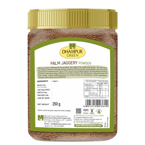 Palm Jaggery powder by Dhampur Green is made by carefully selecting extracting boiling and reducing the sap of Palmyra trees that abound in the coastal districts of South India. This dark brown amorphous powder with a melt-in the mouth texture is obtained without the use of chemicals such as Sulphur dioxide or bleaching agents. We take pride that our Palm Jaggery Powder is an ideal replacement of table sugar alongside its being rich in essential vitamins and minerals. Alongside the sweetness this nutritious sweetener is loaded with vitamins and minerals. It is a digestive aid and energy provider (It takes very little time for palm sugar to be broken down and absorbed by the body. Palm Jaggery powder is traditionally suggested for pregnant ladies to ease difficulties in pregnancy from the 7-month onwards when consumed in the form of traditional concoctions (Kashayam in Tamil).