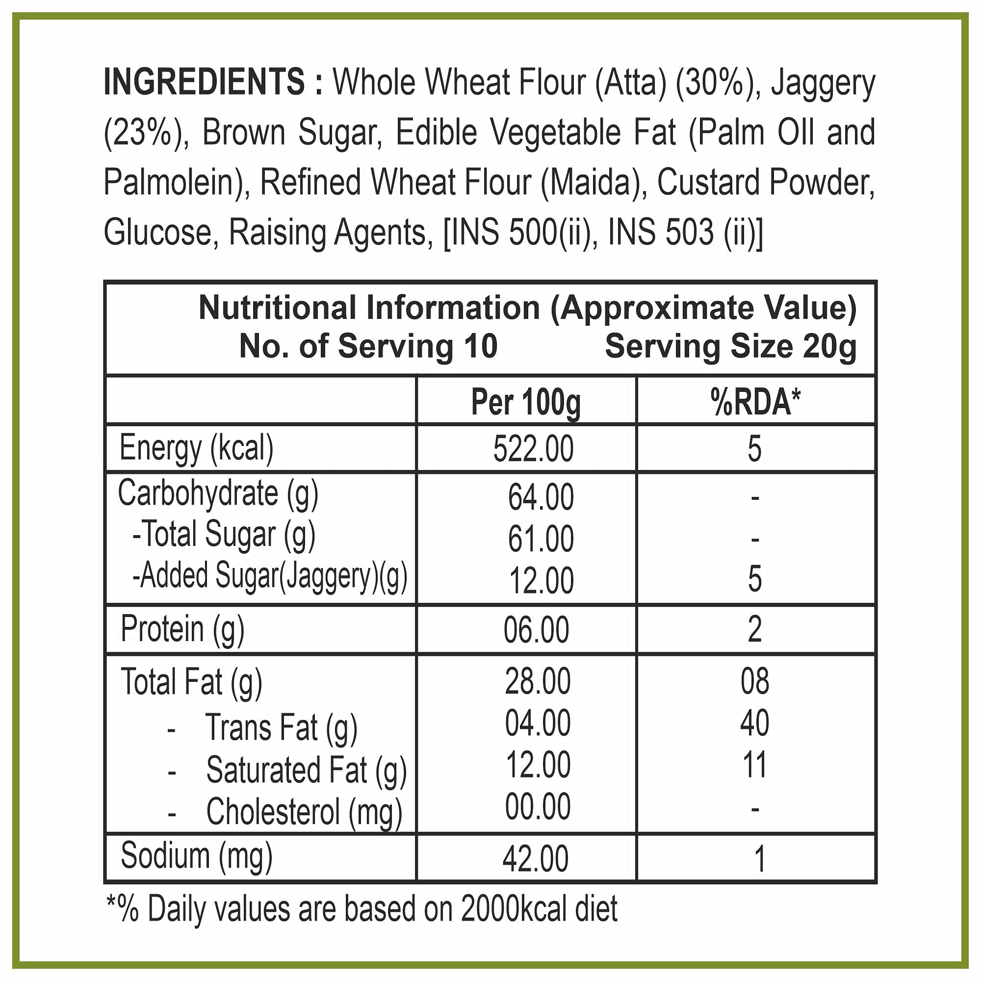 INGREDIENTSWhole Wheat Flour -Atta Jaggery -Gur Desi Ghee Hydrogenated Vegtable Oil Fennel Seeds - Saunf Self-raising Flour Permitted Flavor