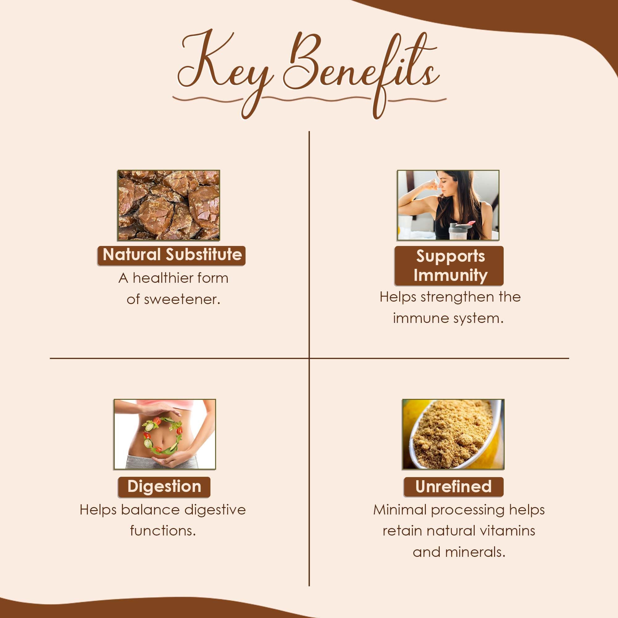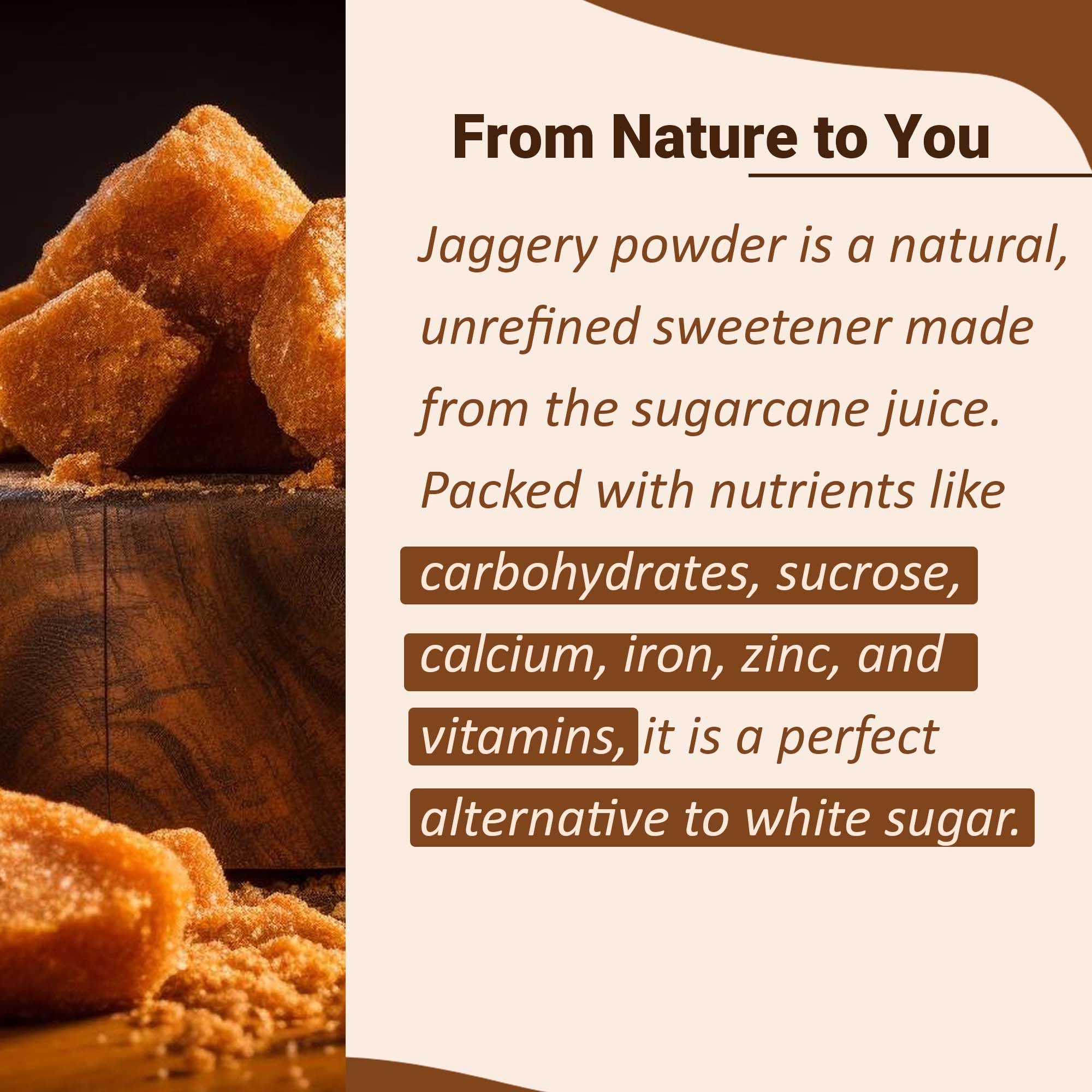 Mi Nature Jaggery Powder - 250gMi Nature Jaggery Powder is a premium pure and unrefined natural sweetener derived from farm-fresh sugarcane. This nutrient-packed alternative to refined sugar not only satisfies your sweet tooth but also provides a range of health benefits. Unlike processed sugars our jaggery powder is free from additives and preservatives making it a wholesome choice for your family. Whether you're looking to sweeten your tea coffee desserts or use it in cooking Mi Nature Jaggery Powder is an ideal healthy substitute for refined sugars Key Benefits100% Pure & Unrefined: Crafted directly from fresh sugarcane without chemical processing preserving its authentic flavor and nutritional integrity.Nutrient-Rich Alternative: Contains essential minerals like iron magnesium potassium and zinc that are typically stripped away in refined sugar.Preservative-Free Formula: Absolutely no chemical additives or preservatives just pure natural jaggery.Natural Energy Booster: Provides sustained energy through complex carbohydrates rather than the quick spike and crash associated with refined sugar.How to UseIn Beverages: Dissolve in hot beverages like tea coffee or milk for a naturally sweet flavor with nutritional benefits.In Baking: Substitute refined sugar with jaggery powder in cakes cookies and breads for a richer taste and added nutrients.In Traditional Recipes: Perfect for authentic Indian sweets desserts and savory dishes that call for jaggery. In Breakfast Items: Sprinkle over oatmeal porridge or pancakes as a healthier sweetening option.Why Choose Mi Nature Jaggery Powder? Mi Nature is dedicated to bringing you authentic natural products that support holistic wellness. Our Jaggery Powder stands out because:Farm-to-Table Freshness: Sourced directly from selected Indian farms to ensure maximum freshness and quality.Traditional Indian Processing: Made using time-tested methods that maintain the nutritional profile of natural jaggery.Versatile Usage: Perfect for both culinary applications and traditional wellness practices.