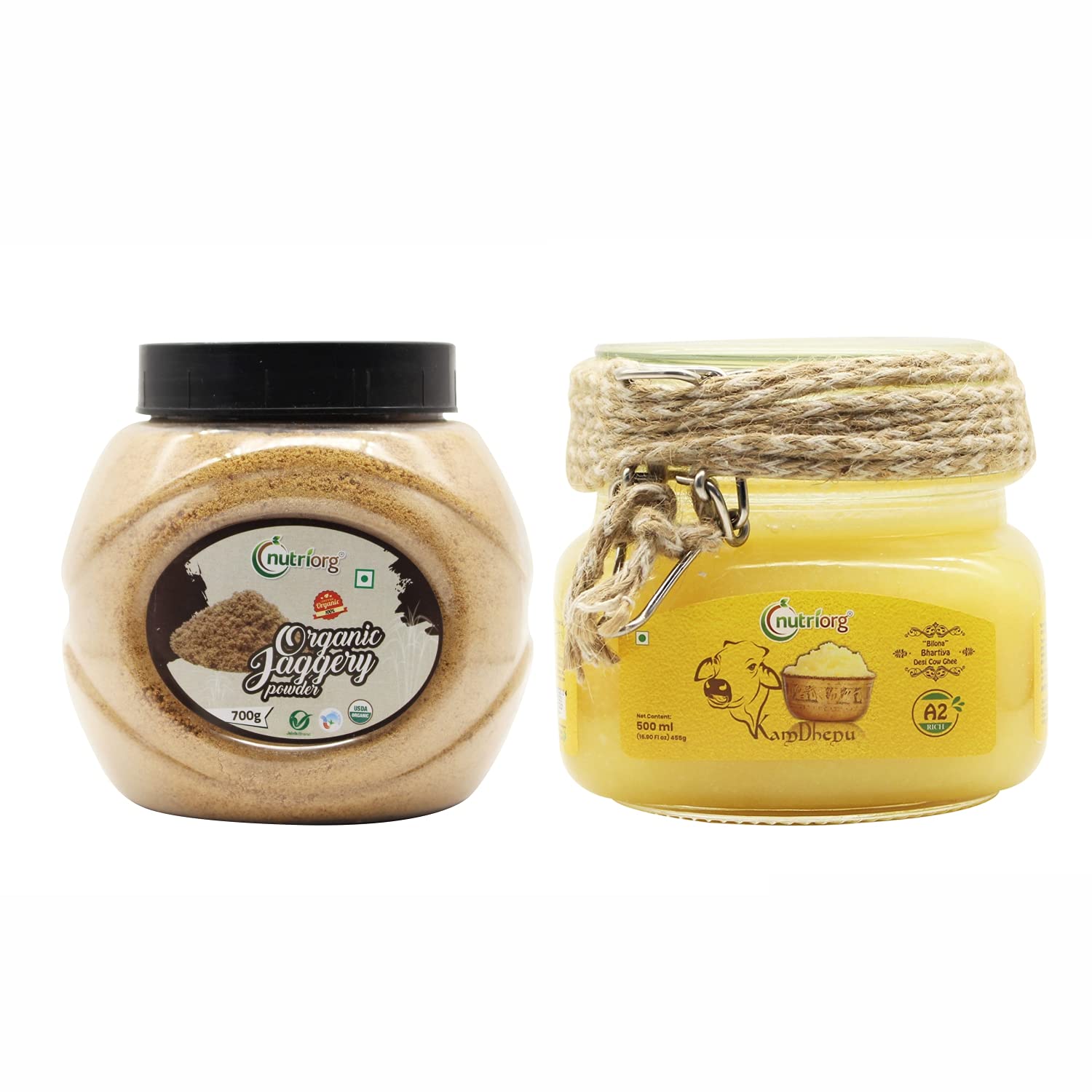Nutriorg Desi Cow Ghee 500 ml & Organic Jaggery Powder 700g Grass-fed Cultured Premium & Traditional Ghee