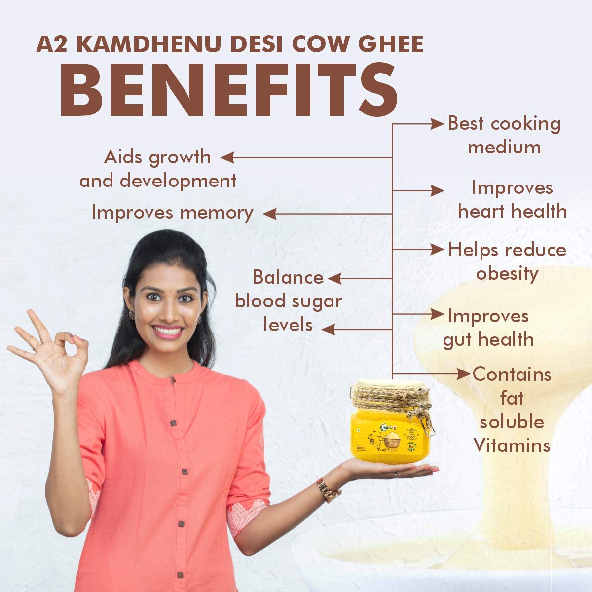 A2 cultured Cow ghee: It is made from milk collected from grass-fed desi Gir cows.