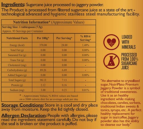 Nutriplato Premium Jaggery Powder is processed without the use of any chemicals with centuries-old proven manufacturing technique. It is prepared under the guidance of the Indian Institute of Sugarcane Research. Processed from pure Sugarcane Juice of a premium quality of Sugarcane. Enjow your health with Nutriplato product range.