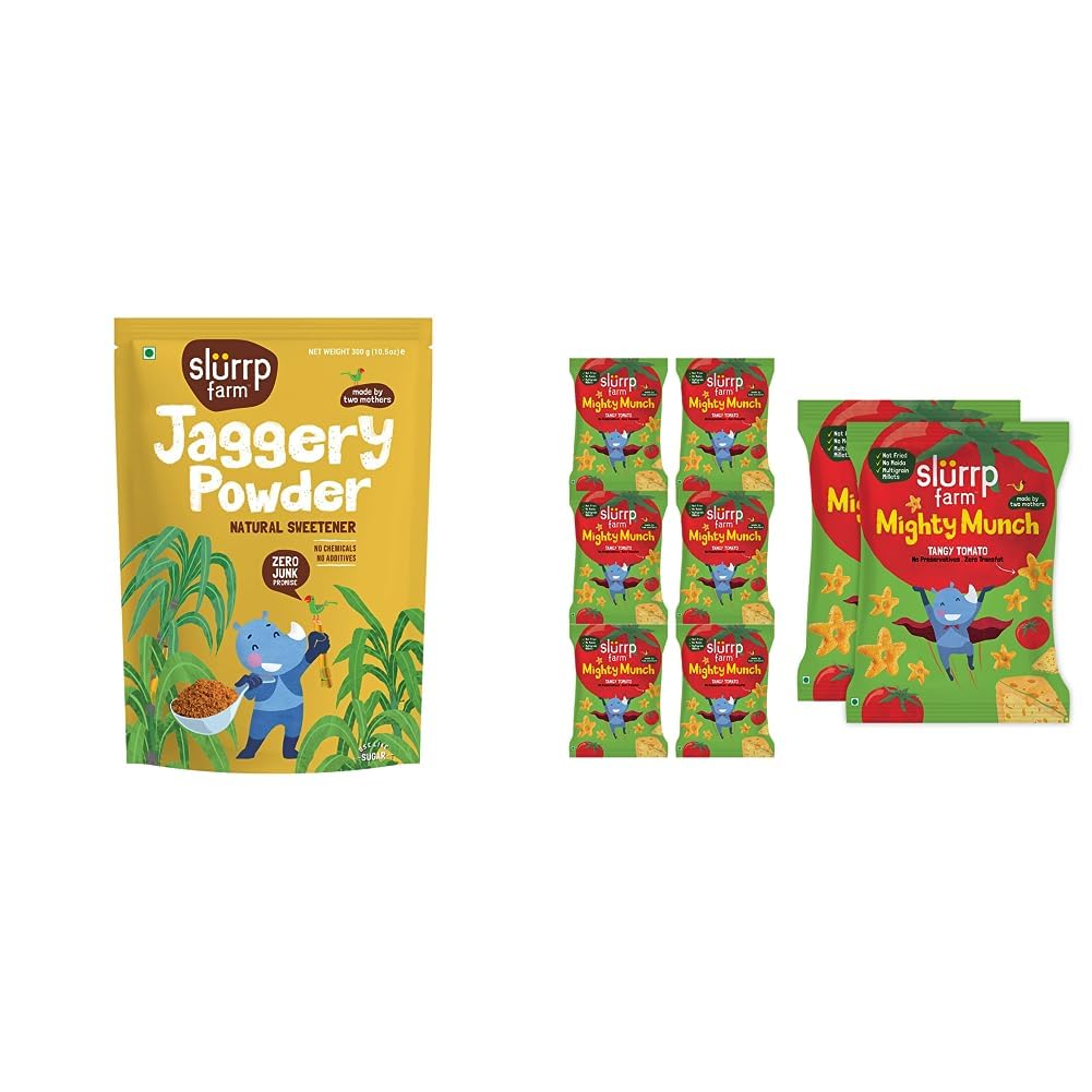 Slurrp Farm Natural Jaggery Powder 300 GSlurrp Farm is founded by two mothers for their children and yours. Our mission is to provide tasty and all natural alternatives to the junk food that surrounds us today. This means no preservatives no artificial flavours and no artificial colours. We are passionate about raising awareness of healthy eating for children by giving parents convenient food options which are as good as what we would make at home.Slurrp Farm Healthy Snacks for Kids | Mighty Puff Tangy Tomato| Not Fried No Maida | Snack for School Tiffin and Travel-Friendly | 8X 20g EachCrunchy-munchy and loaded with nutritional benefits the slurrp farm mighty puff and mighty munch are perfect anytime snacking options for all ages. Zingy-zesty munchies made with real tomato and mango powder combined with ragi and jowar very very yummy in your tummy. Guilt free happiness - they are designed for school going kids to pop into their bags and their parents too. About the brand: at slurrp farm we are passionate about raising awareness of healthy eating for children and giving busy parents like us the convenience needed in terms of being able to find food options which are as good as what we would make at home. Our recipes always start at home from amongst our friends and families. After many home trials we perfect them in consultation with nutritionists and pediatricians.