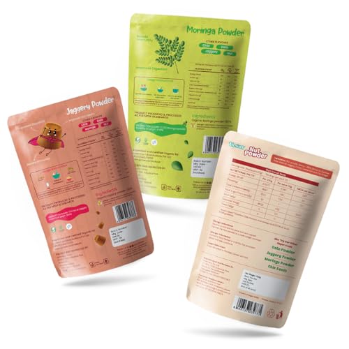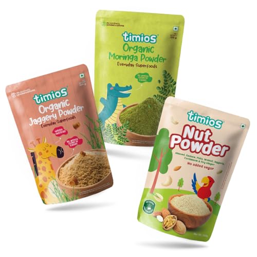 Moringa powder is a plant that is often called the drumstick tree the miracle tree. Moringa has been used for centuries due to its medicinal properties and health benefits. Timios everyday superfood moringa powder is a complementary food for anyone. It can be easily added to everyday meals for a healthy lifestyle. Packed with essential nutrients including proteins vitamins minerals and antioxidants moringa powder is suitable for everyone in the family. Timios moringa powder is produced and processed as per NPOP standards. Timios everyday superfood Jaggery Powder is a complimentary food for all ages above 2 years. This superfood sweetener is unrefined and free from any harmful chemicals or preservatives making it a healthy alternative to regular sugar. Jaggery contains more nutrients than refined sugar because of its molasses content which in turn adds a small amount of micronutrients to the final product. Timios nut powder is rich in essential nutrients such as proteins healthy fats fiber vitamins and minerals. They can be a good source of energy and offer various health benefits. These help in healthy growth and development of little ones. This healthy mix delivers a healthy source of energy while also supporting numerous physiological processes. Timios Nut Powder is not only a nutritional powerhouse but it is also wonderfully handy and simple to include into your daily routine. The options are unlimited whether you combine it into your favourite smoothie sprinkle it over yoghurt or muesli or use it as a topping for fruits and salads. Its gentle and pleasant nutty flavour appeals to young taste receptors encouraging youngsters to eat healthy.